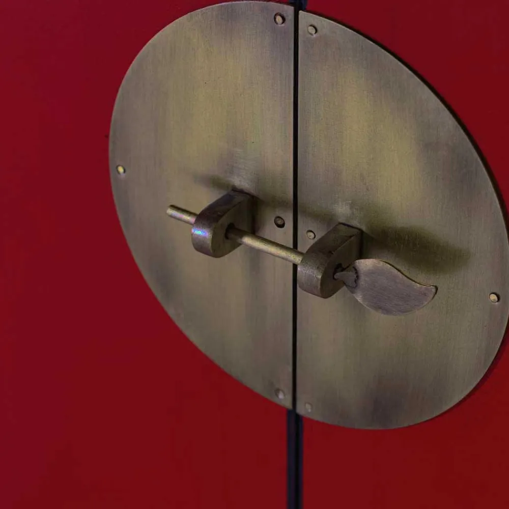 Das Sideboard ist aus massivem Mangobaumholz gefertigt, das für seine Robustheit und seine schöne Maserung bekannt ist. Die Oberfläche ist lackiert und mit kunstvollen, detaillierten Schnitzereien veredelt, die das Möbelstück besonders edel wirken lassen. Der edle Rotton harmoniert perfekt mit den goldenen Akzenten und den altmessingfarbenen Muschelgriffen, die dem Sideboard seinen exklusiven Charakter verleihen. Die vier Türen sind mit robusten Metallscharnieren versehen und öffnen sich sanft, während die mittig platzierten drei Schubladen mit Holzauszügen für zusätzliche Ordnung sorgen. Auf jeder Seite befindet sich zudem ein Einlegeboden, der weiteren Stauraum bietet.