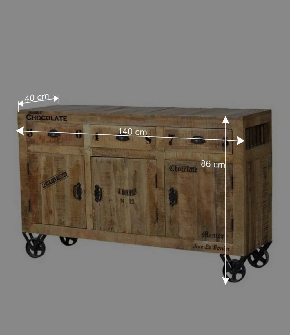„Indri“ bietet nicht nur ein atemberaubendes Design, sondern auch praktischen Stauraum. Mit Maßen von 140 cm Breite, 86 cm Höhe und 40 cm Tiefe, verfügt sie über drei Türen mit langlebigen Metallscharnieren und jeweils einem Einlegeboden dahinter. Zusätzlich sind drei Schubkästen mit robustem Holzauszug und offenen Seiten, versehen mit urigen Metallstangen, vorhanden. Die Front ist mit dekorativen Schriftzügen versehen, die den Charakter dieses Möbelstücks unterstreichen.