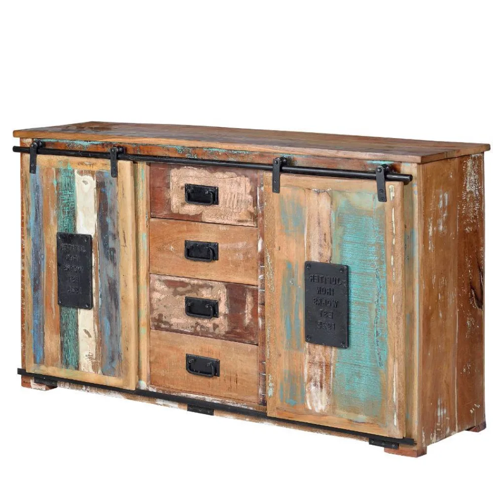Die Altholz Kombikommode „Jevilia“ vereint rustikalen Charme mit einzigartigem Design. Gefertigt aus wiederverwertetem Holz alter Boote und Möbelstücke, erzählt jedes Exemplar seine eigene Geschichte. Die Oberfläche zeigt bewusst erhaltene Lackreste und Gebrauchsspuren, die dem Möbelstück seine authentische Vintage-Ästhetik verleihen. Durch die individuelle Handarbeit ist jede Kommode ein unverwechselbares Unikat, das Ihrem Wohnraum eine besondere Note verleiht.
