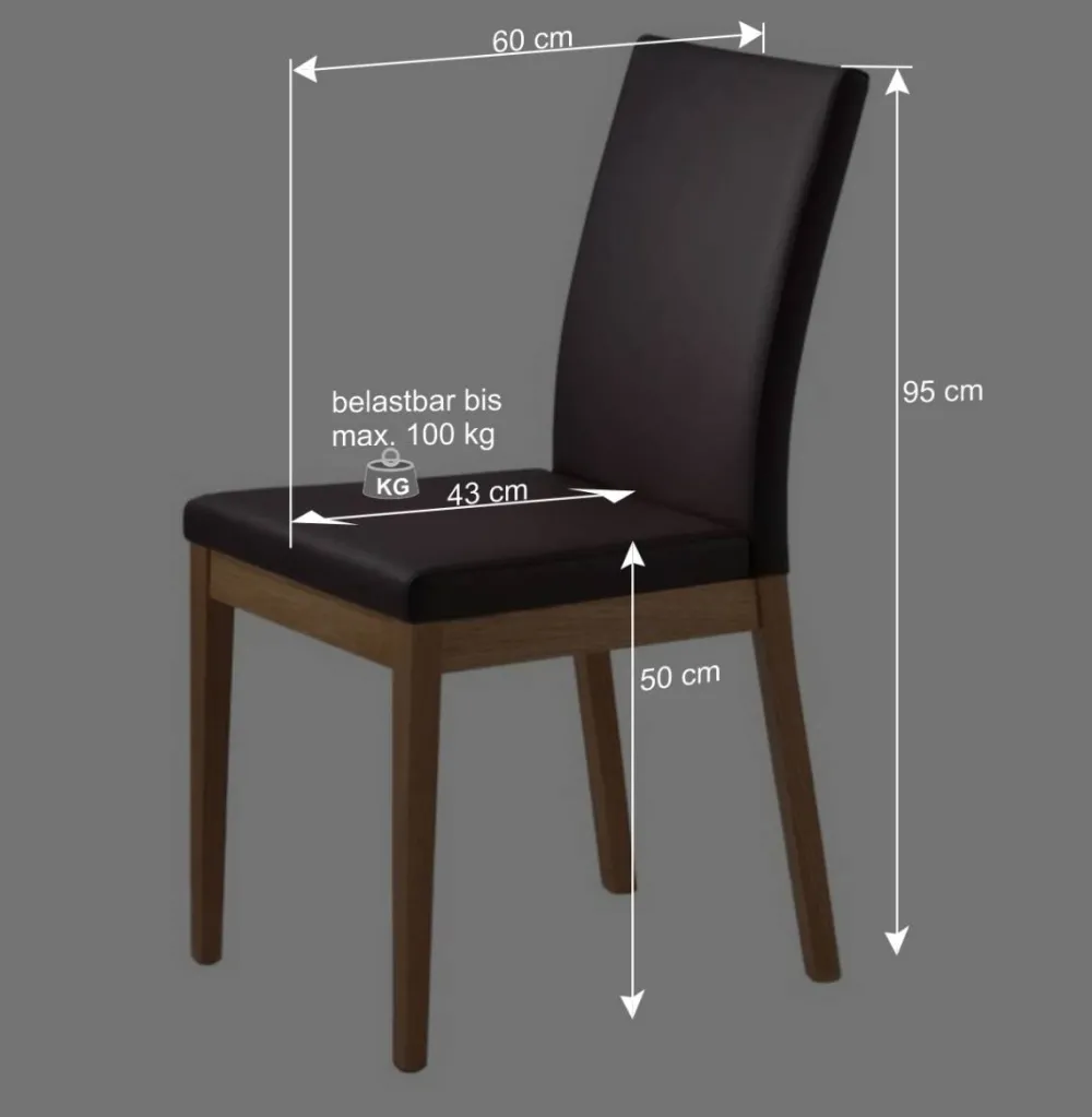 Jeder der vier Stühle kombiniert dunkle Polyurethan-Kunstlederbezüge mit einem stabilen Gestell aus Massivholz. Die Polsterung von Sitzfläche und Rückenlehne sorgt für hohen Komfort – ideal für lange Abende am Esstisch. Die ergonomisch geformte Rückenlehne unterstützt eine angenehme Sitzhaltung. Mit einer Sitzhöhe von ca. 50 cm und einer Sitzbreite von ca. 60 cm bieten die Stühle viel Platz und ein großzügiges Sitzgefühl. Bis zu 100 kg Tragkraft pro Stuhl sowie das stabile Vierfußgestell garantieren Sicherheit und Langlebigkeit – bei jeder Nutzung.