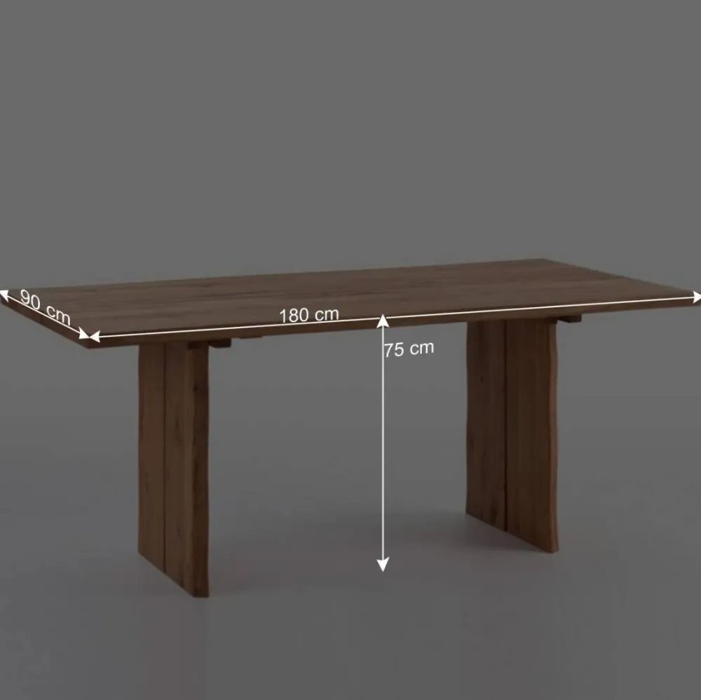 Die Tischplatte mit einer Stärke von ca. 4 cm zieht sofort alle Blicke auf sich. Auch hier sorgt die naturbelassene Baumkante für eine kraftvolle, handwerkliche Ausstrahlung. Der mittig verlaufende Spalt, entstanden durch die Konstruktion aus zwei Platten, verleiht der Oberfläche zusätzliche Tiefe und Charakter. Windrisse und kleine Unebenheiten wurden bewusst erhalten, um die Einzigartigkeit jedes Tisches zu bewahren. Gehalten wird die Tischplatte von einem robusten Wangengestell, das sowohl visuell als auch funktional Stabilität und Solidität vermittelt.