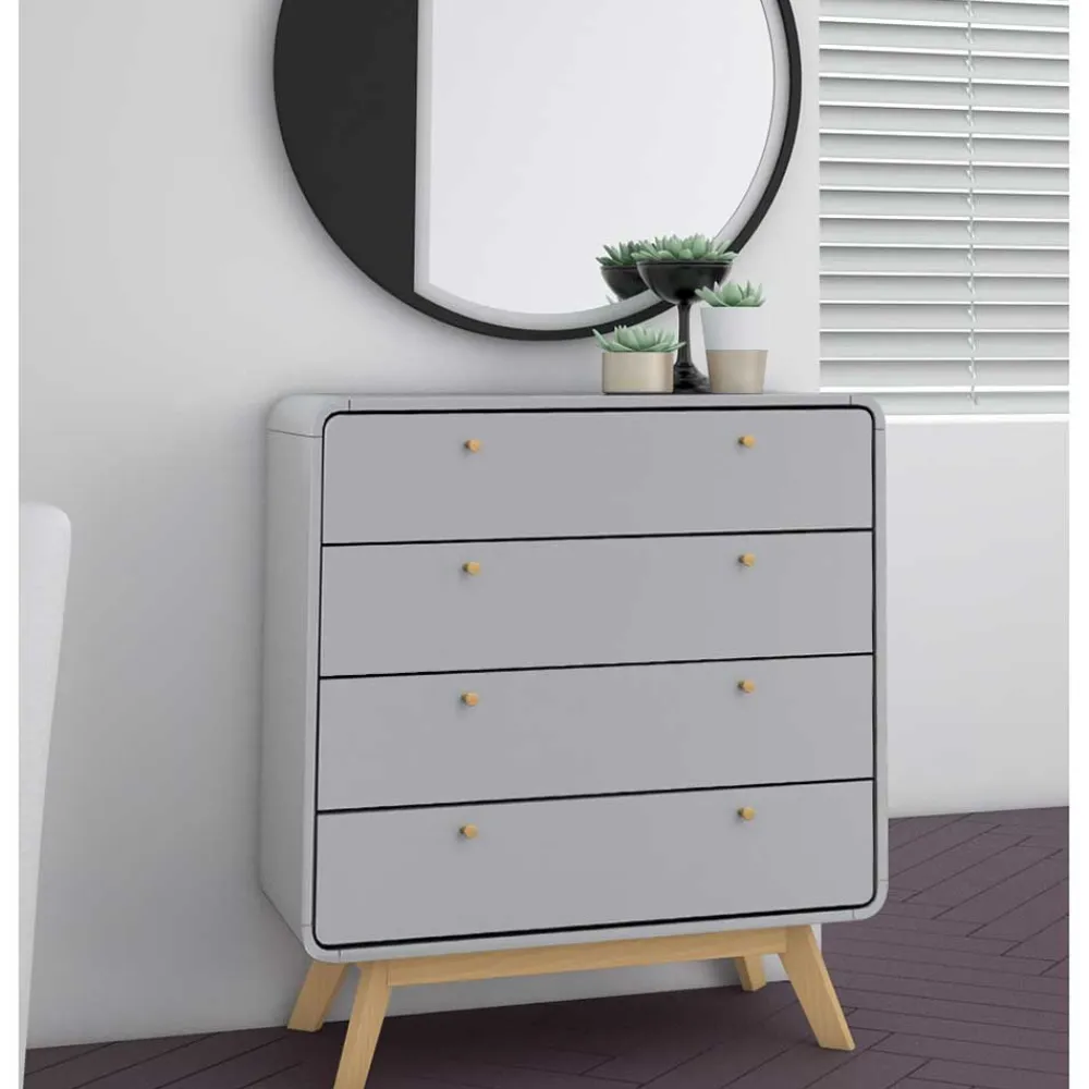 Mit Maßen von 80 cm Breite, 87 cm Höhe und 39 cm Tiefe bietet die Kommode „Wavan“ überraschend viel Stauraum auf kleiner Fläche. Die vier Schubladen mit Metallauszug und praktischen Innenmaßen bieten reichlich Platz für Ihre Habseligkeiten. Die kleinen Kunststoff-Knopfgriffe runden das Design ab und sorgen für eine einfache Handhabung.