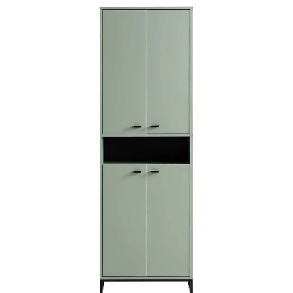 Die schwarzen Griffleisten aus Metall sorgen nicht nur für einen stilvollen Kontrast, sondern erleichtern auch die Bedienung der Türen. Das schwarze Metallbügelgestell hebt den Schrank dezent vom Boden ab und verleiht ihm eine schwebende Leichtigkeit, die den Raum größer wirken lässt. Eine Kippsicherung zur Wandmontage sorgt für zusätzliche Sicherheit, besonders in Haushalten mit Kindern oder Haustieren.