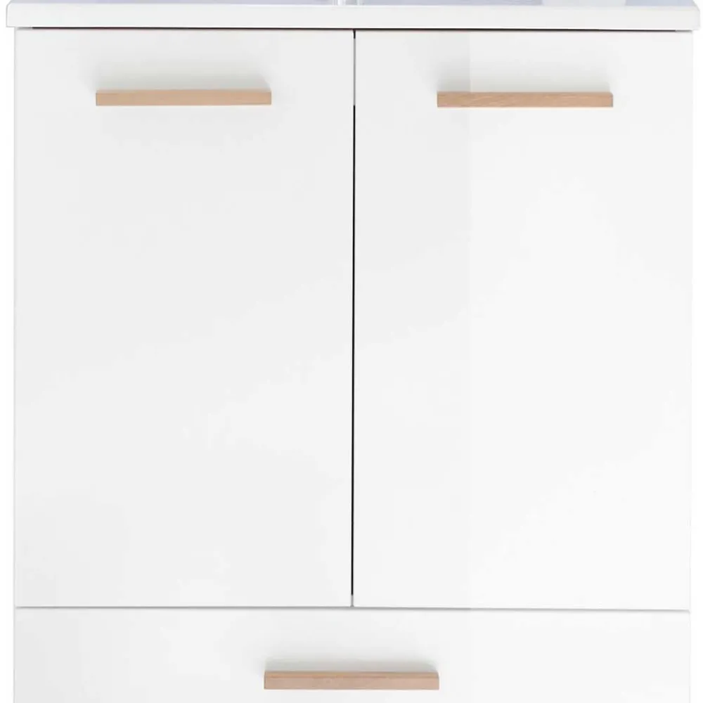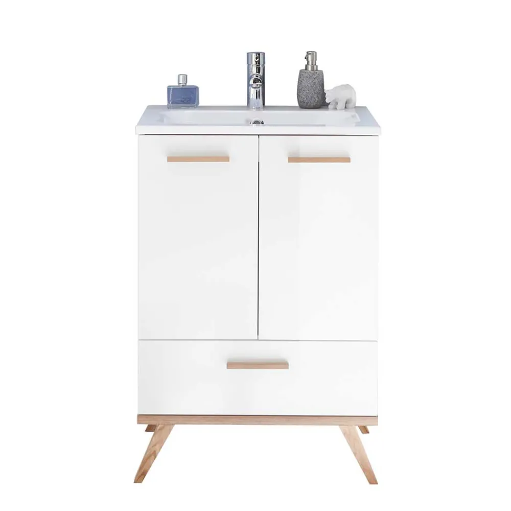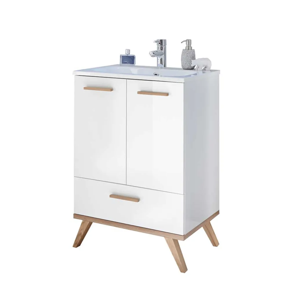 Der Korpus des Waschtisches besteht aus robuster Spanplatte mit einer Stärke von 1,6 cm und ist mit strapazierfähigem Melaminharz beschichtet. Diese widerstandsfähige Oberfläche schützt den Waschtisch zuverlässig vor Feuchtigkeit und Kratzern. Die Front glänzt in edlem Weiß, während die Seitenteile und Rückwand dezent matt gehalten sind und die Bodenplatte in Holzoptik den warmen Eiche-Natur-Look aufgreift. Zusätzlich sind die Kanten mit stoßfestem ABS-Material versehen, um das Möbelstück noch langlebiger zu machen. Massivholz-Griffleisten aus Eiche und solide, leicht verjüngte Holzfüße sorgen für Stabilität und runden das Design stimmig ab.