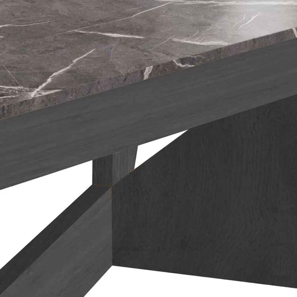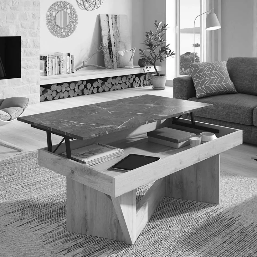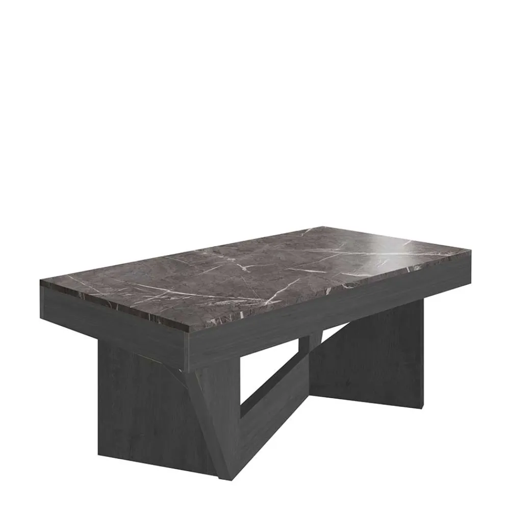 Die rechteckige Stellfläche von 110 x 60 cm bietet großzügig Platz – ideal für Kaffee, Deko oder Laptop. Die schwarzgrau marmorierte Tischplatte setzt einen stilvollen Kontrast zur dunklen Holzoptik des Gestells und macht Cadruna zu einem echten Blickfang. Das Wangengestell überzeugt durch seine interessante Konstruktion und sorgt für einen absolut sicheren Stand. Kein Wackeln, kein Rutschen – nur solider Komfort und ästhetischer Anspruch in Perfektion.