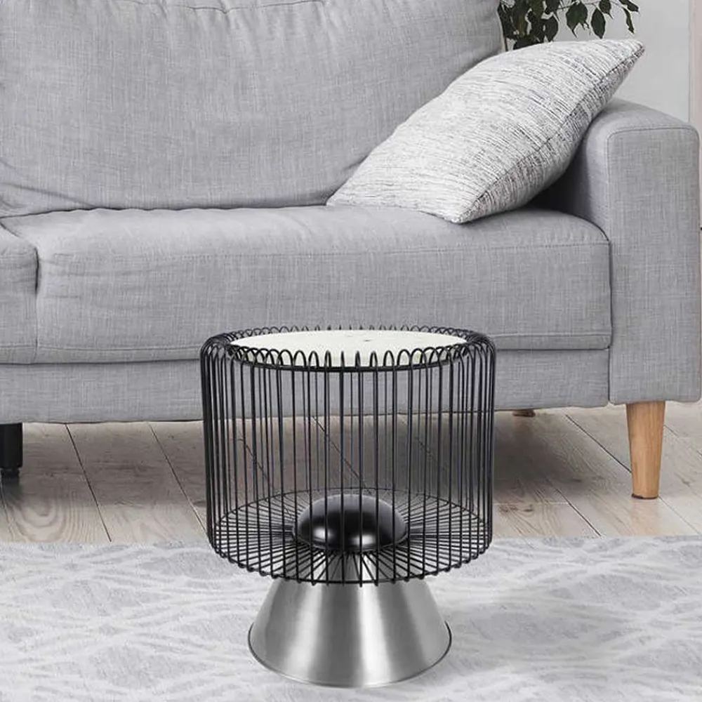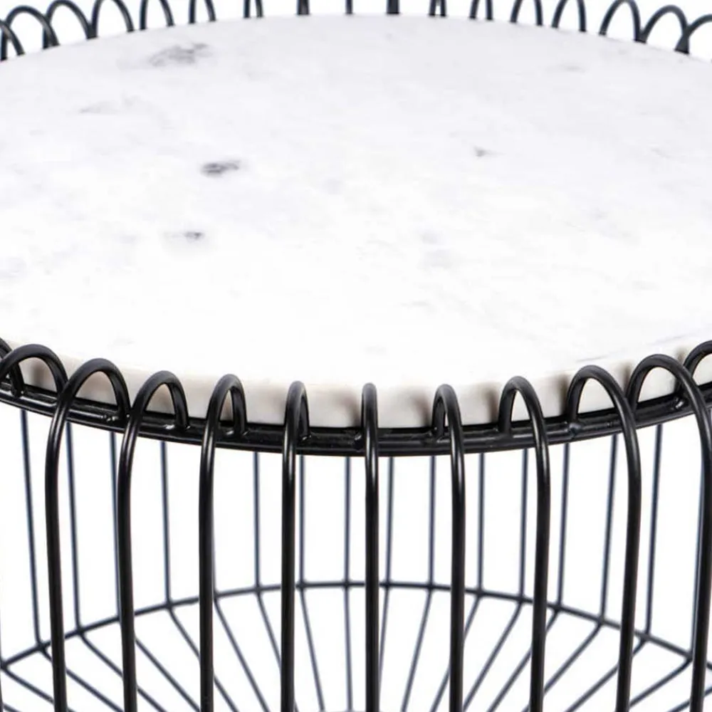 Als Tischplatte kommt edler, weißer Marmor zum Einsatz – ein Naturmaterial mit einzigartiger Maserung, das jedem Exemplar einen individuellen Charakter verleiht. Mit einer Materialstärke von ca. 1,5 cm und einem Durchmesser von rund 40 cm bietet die Platte nicht nur eine hochwertige Optik, sondern auch Stabilität im Alltag. Der Unterbau begeistert durch seine extravagante Gestaltung: Ein kunstvoll geformter Drahtkorpus in tiefem Schwarz trifft auf einen silberfarbenen Sockel – beide Bestandteile bestehen aus robustem Metall mit lackierten Oberflächen.