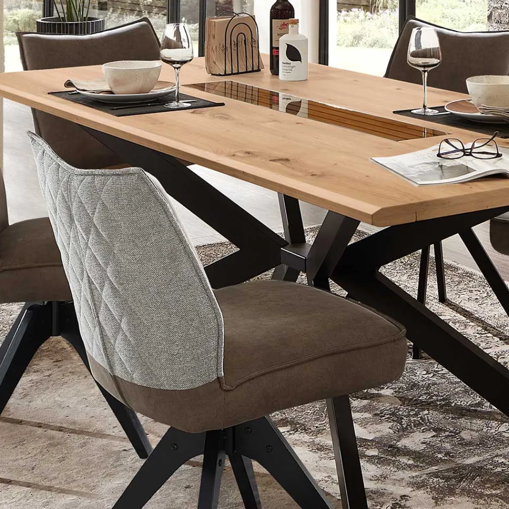 Eine besondere Raffinesse des Tischdesigns ist die mittige Absetzung in Paneeloptik mit Glasauflage. Diese stilvolle Kombination verleiht dem Tisch eine moderne und zugleich zeitlose Ästhetik, die sich perfekt in verschiedene Einrichtungsstile integrieren lässt. Der aufgedoppelte Rand der Tischplatte sorgt für zusätzliche Stabilität und verleiht dem Tisch ein massives Aussehen.