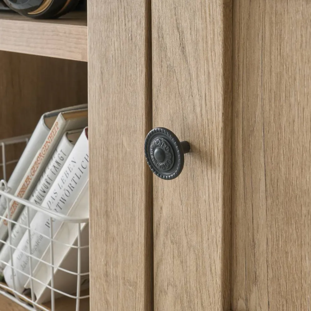Für die Fertigung des TV-Lowboards „Hengas“ wurde hochwertiger Holzwerkstoff verwendet. Die widerstandsfähigen, pflegeleichten Oberflächen sind melaminbeschichtet und zeigen eine warme Holzoptik in Eiche Gold, die das natürliche Erscheinungsbild authentisch wiedergibt. Die Rückwand in Schwarz sorgt für einen modernen Kontrast, während filigran verzierte Knopfgriffe aus Metall in Altsilber den Landhaus-Look geschmackvoll abrunden.