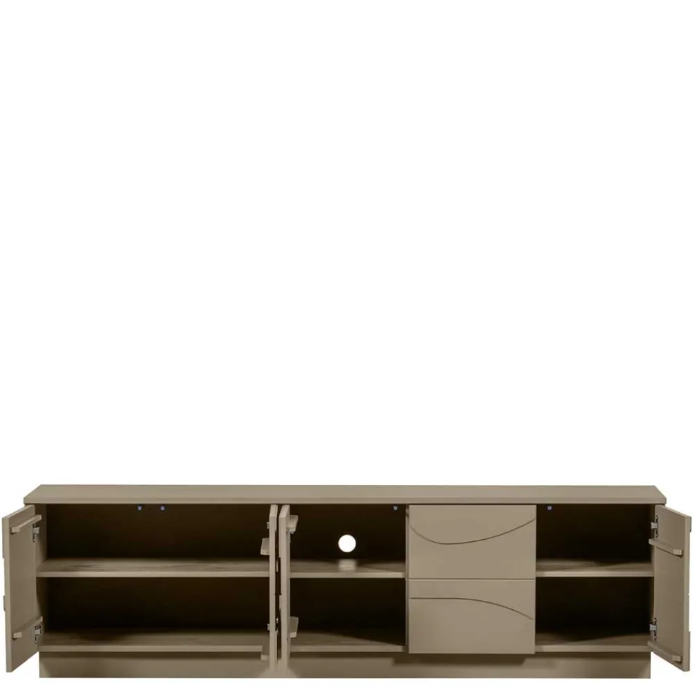 Hinter fünf Drehtüren verbirgt sich großzügiger, staubgeschützter Stauraum. Drei Einlegeböden mit einer Breite von zweimal 69 cm und einmal 34 cm bieten ausreichend Platz für Multimedia-Geräte, DVDs oder andere Wohnaccessoires. Jeder Einlegeboden hält einer Belastung von bis zu 15 kg stand. Die grifflose Push-to-open-Funktion ermöglicht ein komfortables Öffnen und Schließen der Türen. Ein weiteres praktisches Detail: Hinter der mittleren Tür sorgt eine integrierte Kabelführung in der Rückwand für eine aufgeräumte Verkabelung Ihrer Geräte.