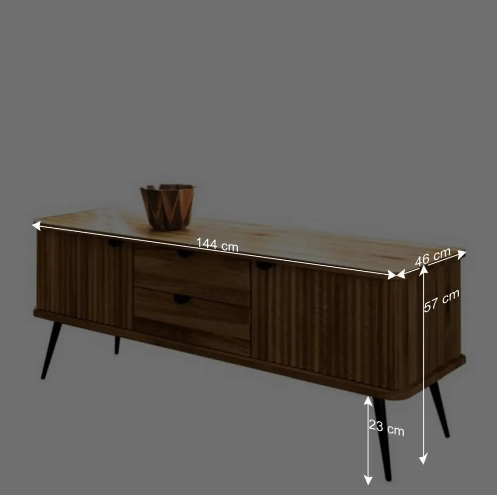 Das in Schwarz matt lackierte Metall-Vierfußgestell mit konisch zulaufenden Beinen verleiht dem Lowboard eine Höhe von ca. 23 cm und rundet das Design perfekt ab. Eine zusätzliche Wandsicherung wird empfohlen, um absolute Stabilität zu gewährleisten.