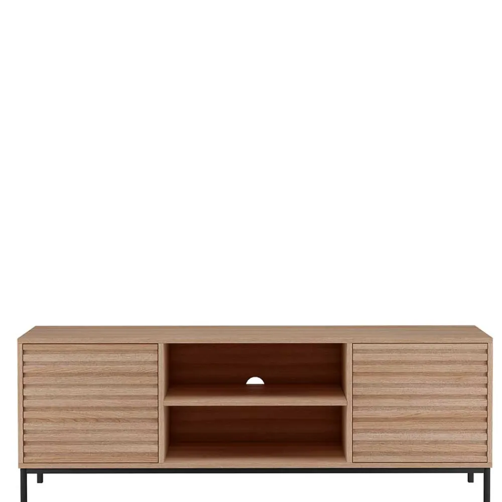 Mit einer Breite von 140 cm, einer Höhe von 50 cm und einer Tiefe von 40 cm bietet das Lowboard eine großzügige Stellfläche für Fernseher und Zubehör, ohne dabei zu wuchtig zu wirken. Die dekorativ gerillten Türfronten setzen stilvolle Akzente und verleihen dem Möbelstück einen unverwechselbaren Charakter.