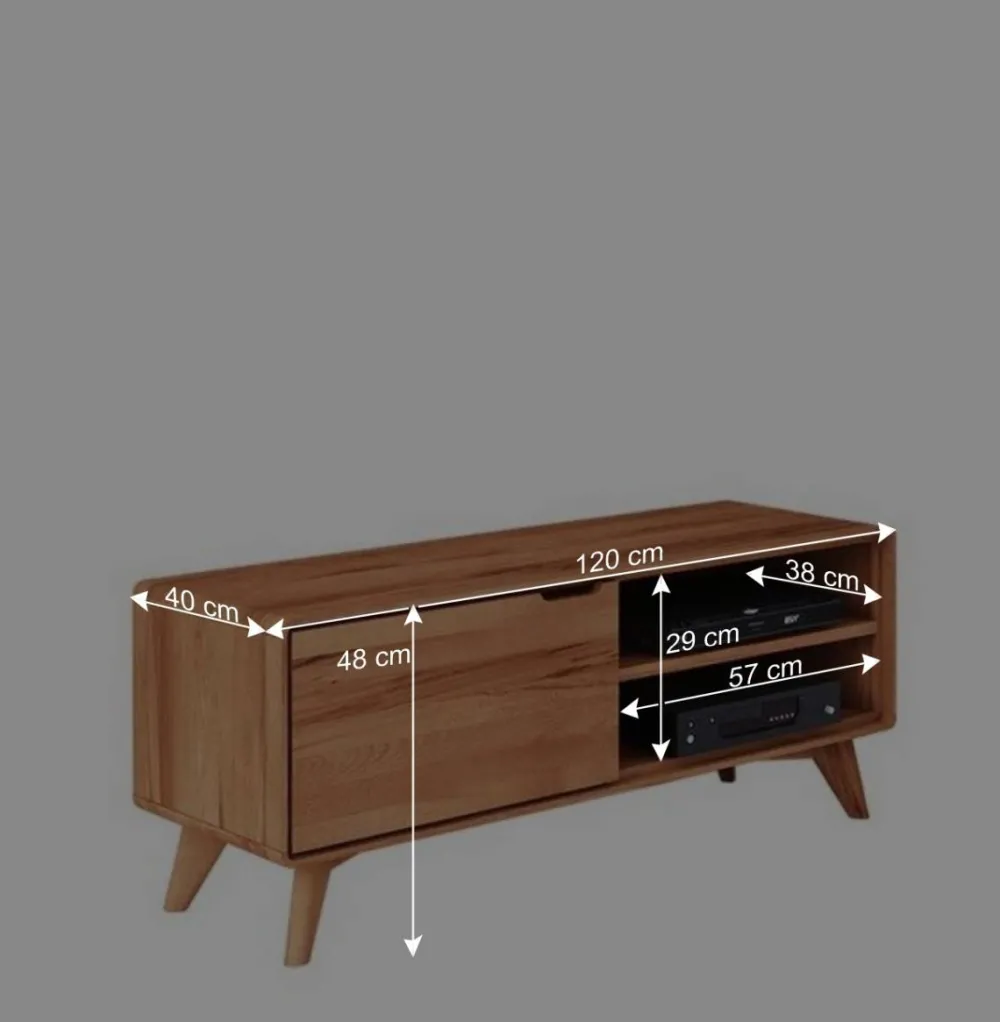 Mit einer Breite von 120 cm, einer Höhe von 48 cm und einer Tiefe von 40 cm eignet sich das TV-Lowboard ideal für moderne Flachbildfernseher unterschiedlicher Größen. Es bietet dabei nicht nur eine stilvolle Präsentationsfläche für Ihren Fernseher, sondern auch genügend Stauraum für all Ihr TV-Zubehör.