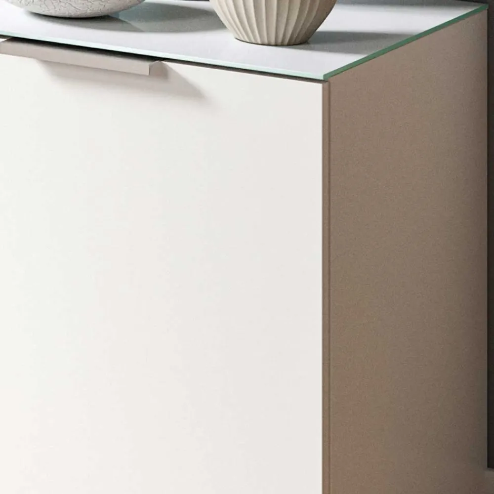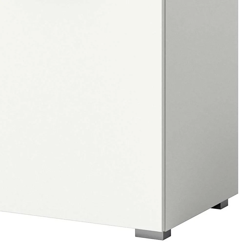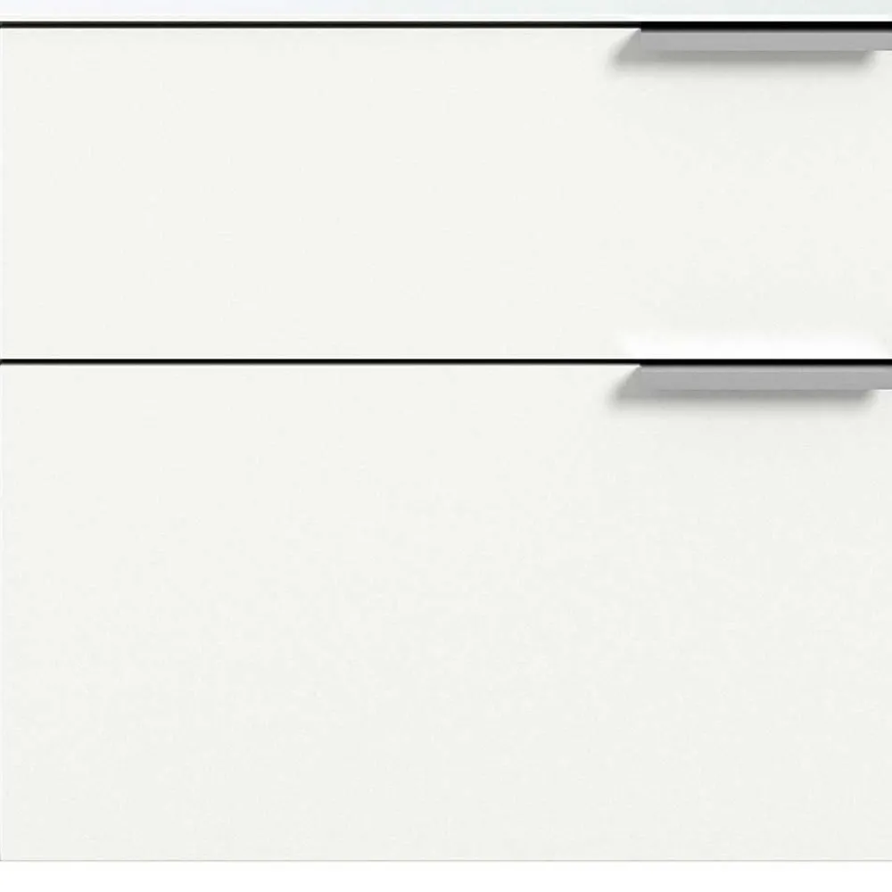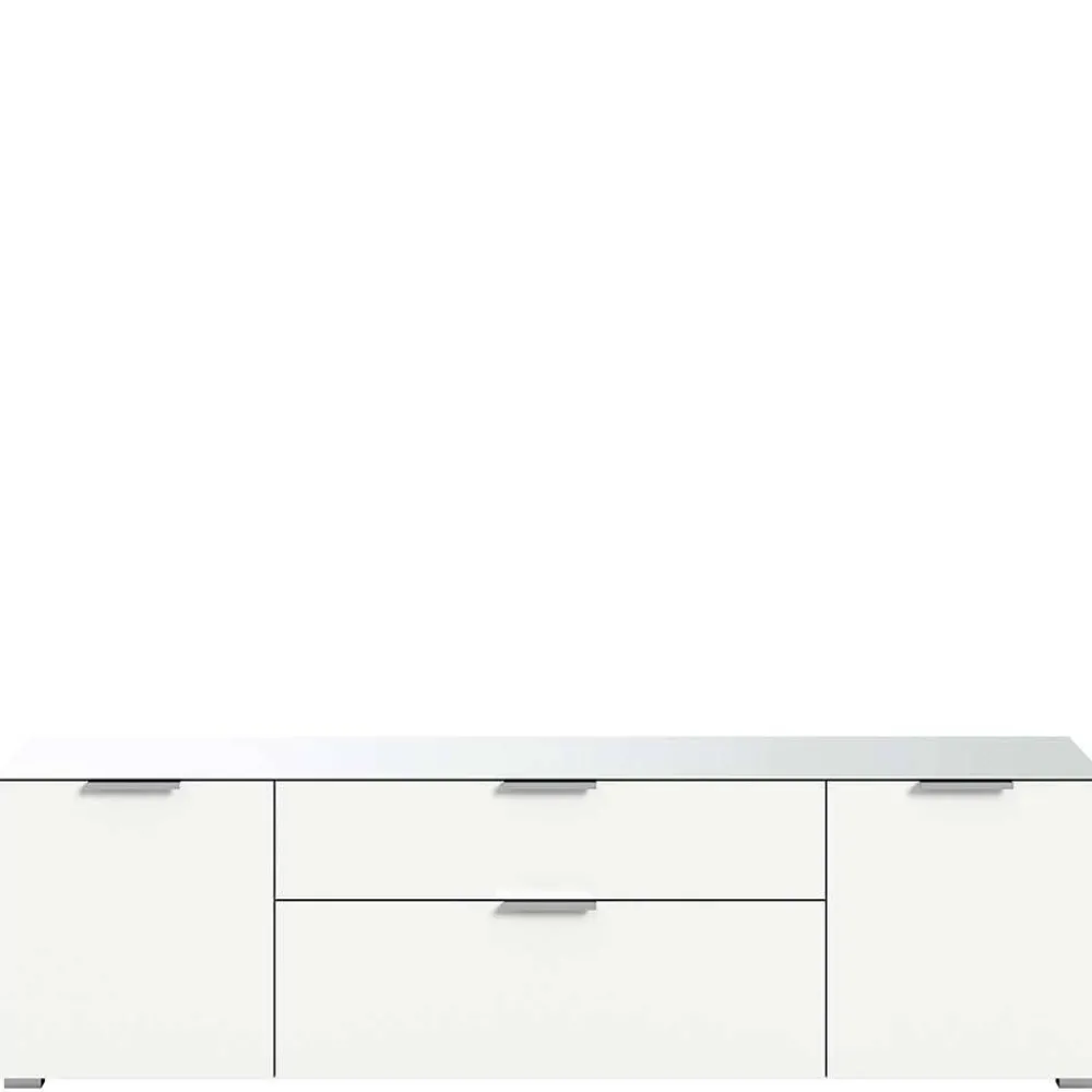 Gefertigt aus robuster Spanplatte, punktet das TV-Element durch seine langlebige Verarbeitung. Die Deckplatte mit weißem Siebdruckglas (3 mm Stärke) verleiht dem Möbel nicht nur optische Raffinesse, sondern schützt auch die Oberfläche zuverlässig. Dezente Aluminium-Kantengriffe fügen sich unauffällig in das Gesamtbild ein, während silberfarbene Kunststoff-Bodengleiter für einen sicheren Stand sorgen.