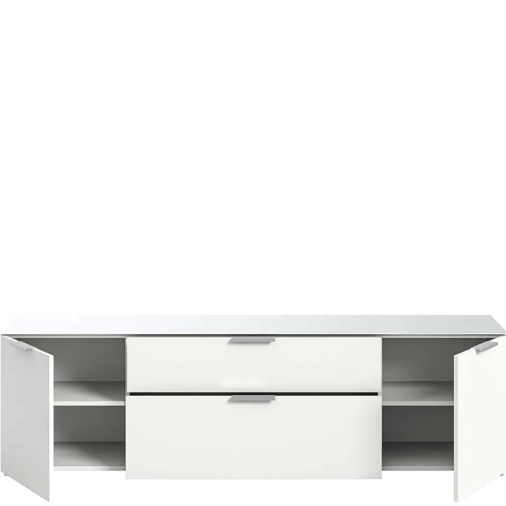 Der TV-Unterschrank „Intiatos“ vereint modernes Design mit funktionalem Anspruch und überzeugt durch seine klare, schnörkellose Formensprache. Die Kombination aus weiß folierten Oberflächen und einer eleganten Glasauflage auf der Deckplatte verleiht dem Möbelstück eine besonders leichte, zeitgemäße Anmutung. Perfekt für Wohnräume, die Wert auf Stil und Struktur legen – und ideal als zentrale Bühne für Ihren Fernseher und Mediaplayer.