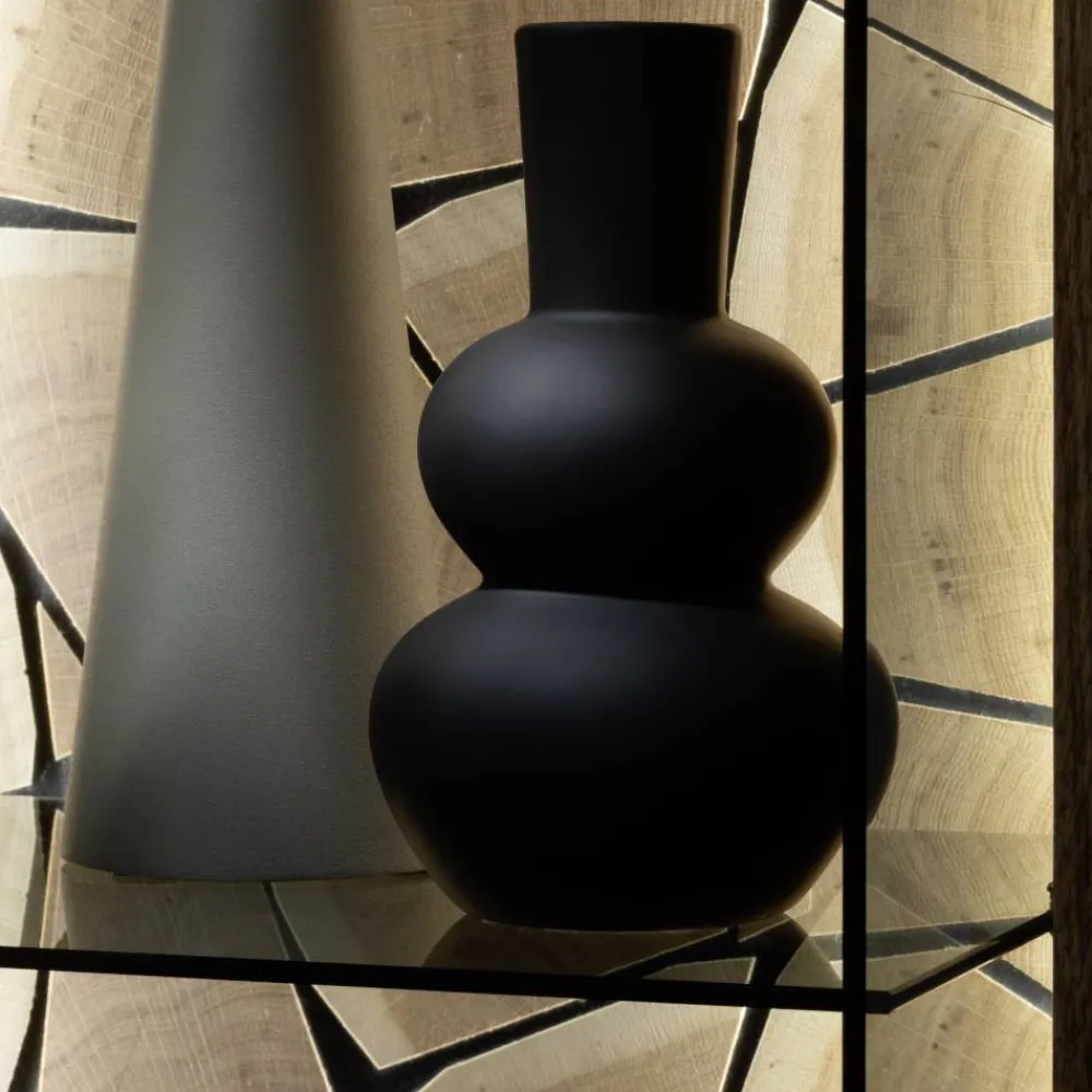 Im Inneren erwarten Sie ein verstellbarer Glasboden, zwei flexibel einsetzbare Einlegeböden sowie ein stabiler Konstruktionsboden. Der Glasboden lässt sich mit dem beiliegenden LED Band inklusive Fernbedienung beleuchten, sodass dekorative Elemente warm erstrahlen und in eindrucksvolles Licht getaucht werden. Hinter dem Glasausschnitt sorgt die sichtbare Rückwand aus Scheitholzfurnier auf anthrazitfarbener HDF Platte für Tiefe und Charakter – ein faszinierender Hintergrund, der jede Präsentation optisch aufwertet.