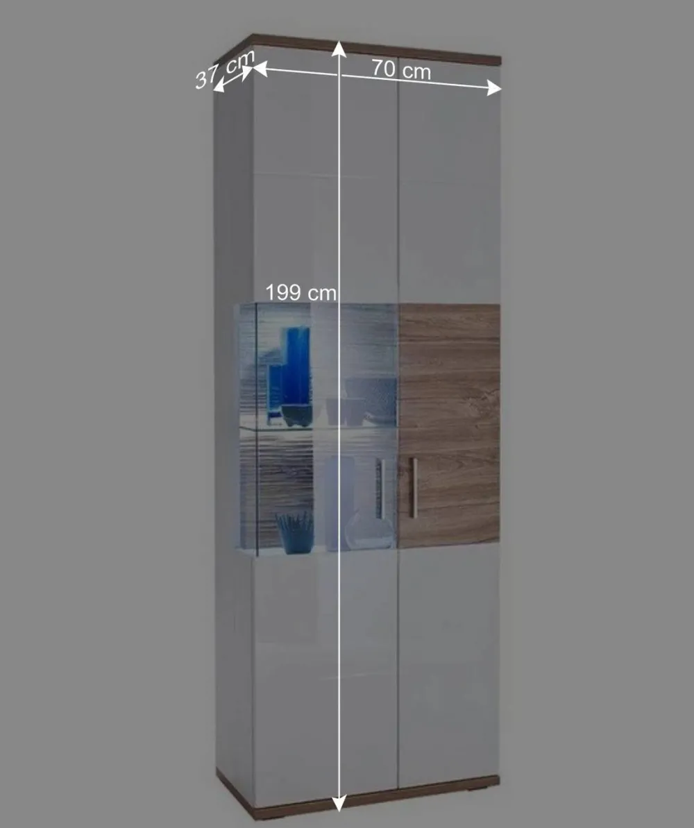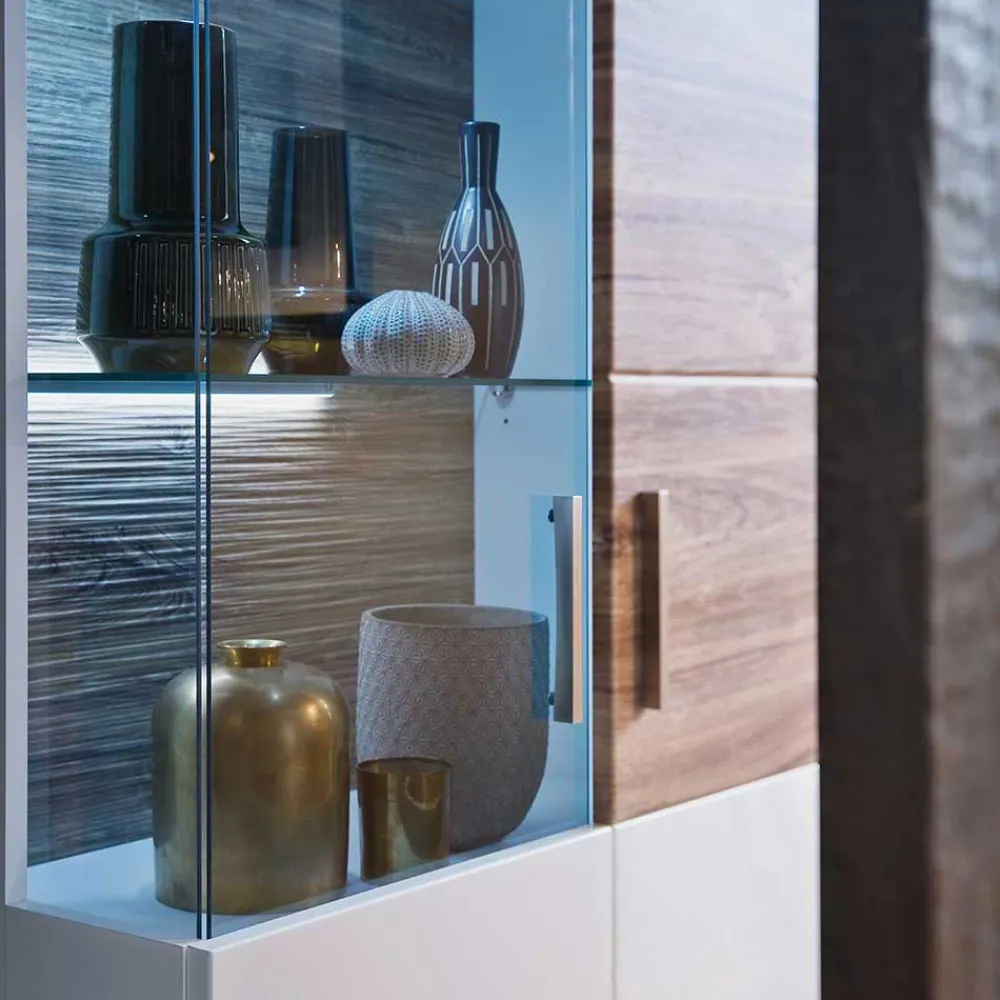 Die Vitrine „Icadro“ beeindruckt mit einem atemberaubenden zweifarbigen Design. Die Front, aus MDF gefertigt, erstrahlt in einem glänzenden Weiß, während der Korpus in mattem Weiß foliert ist. Die Absetzungen sowie die Deckplatte und der Sockel sind in einem Holzdekor Balkeneiche foliert, was nicht nur einen stilvollen Kontrast schafft, sondern auch eine warme und gemütliche Atmosphäre in Ihrem Raum schafft.