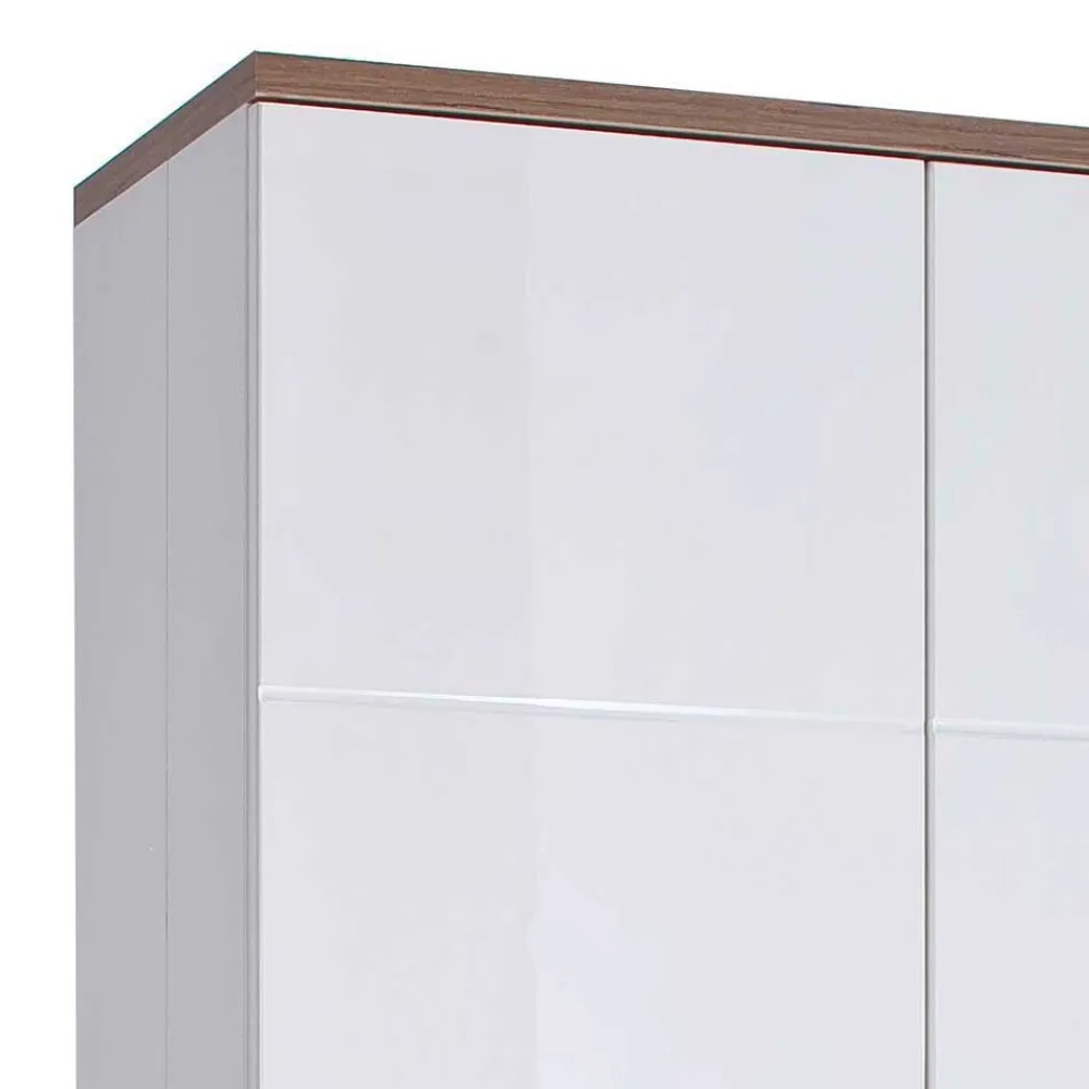 - Front in hochglänzend Weiß und Korpus in matt Weiß foliert, Absetzungen, sowie Deckplatte und Sockel foliert im Holzdekor Balkeneiche