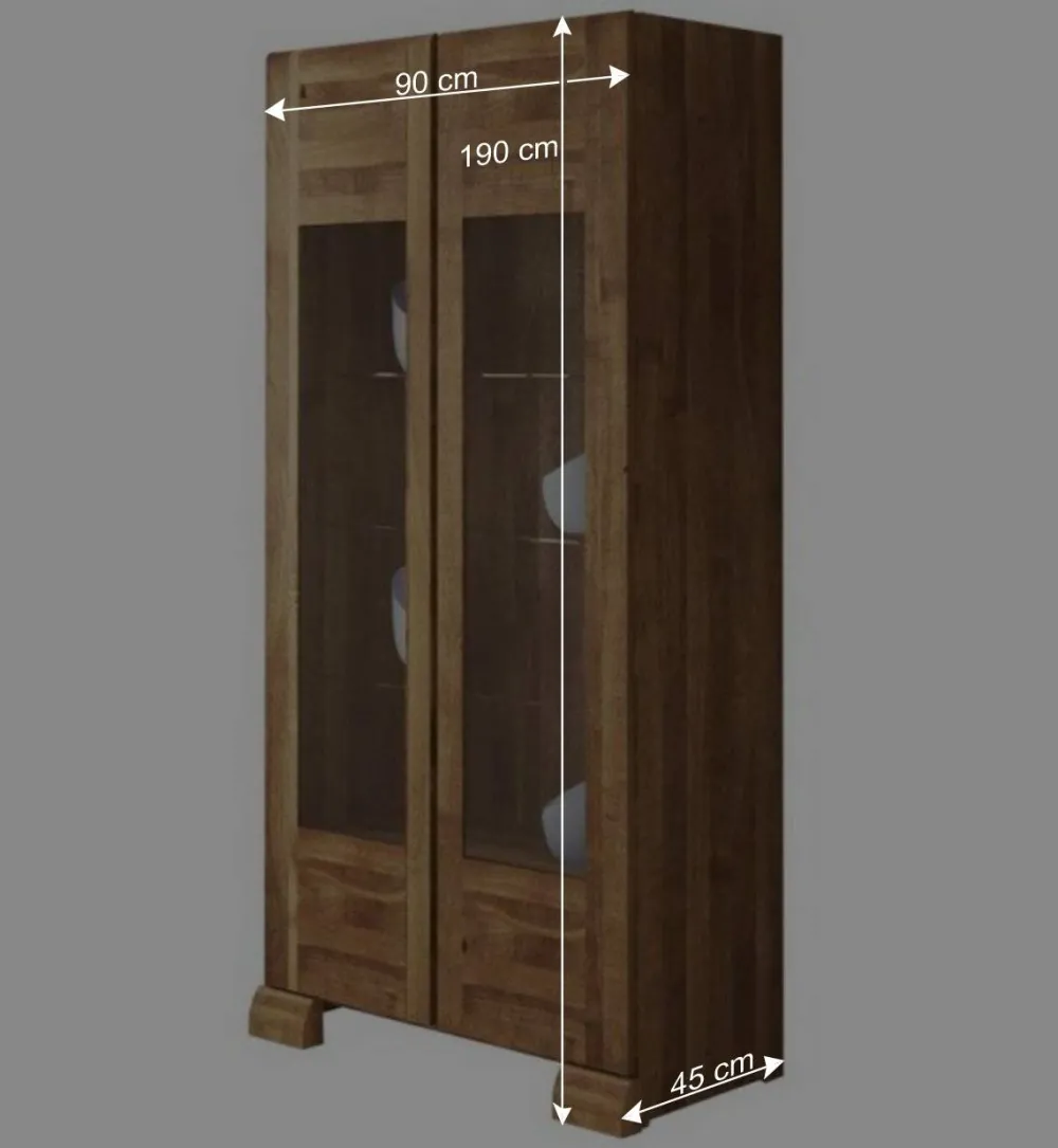 Mit einer Breite von 90 cm, einer Höhe von 190 cm und einer Tiefe von 45 cm bietet die Standvitrine „Vaskov“ großzügigen Stauraum, ohne dabei zu viel Platz einzunehmen. Die robuste Oberplatte mit einer Stärke von 2 cm sorgt für zusätzliche Stabilität. Im Inneren finden Sie drei durchgehende Glasböden und zwei Holzböden, die flexible Aufbewahrungsmöglichkeiten bieten und Ihre Dekorationsgegenstände, Bücher oder Geschirr stilvoll zur Geltung bringen.