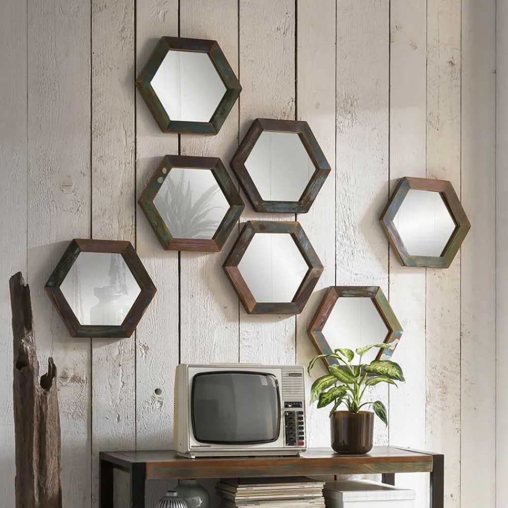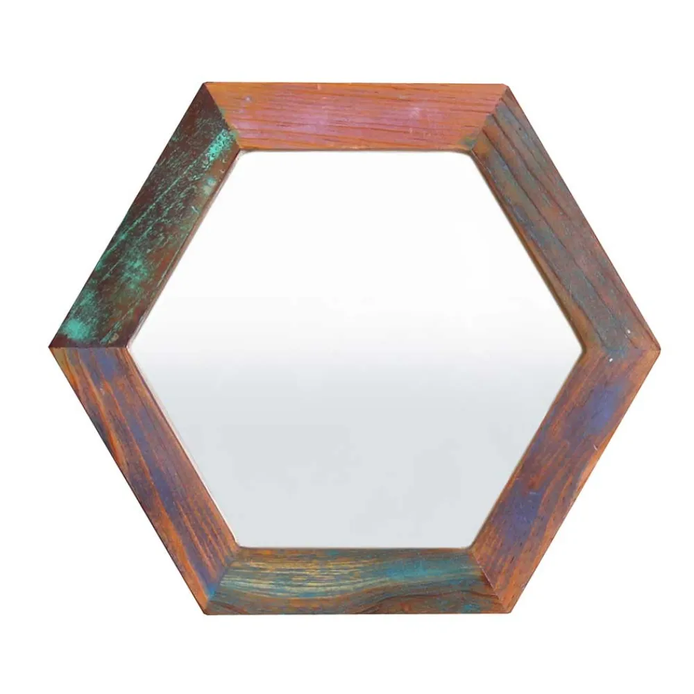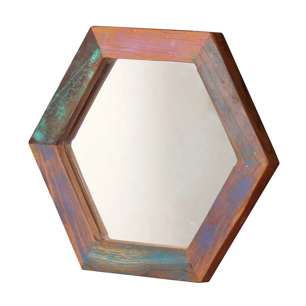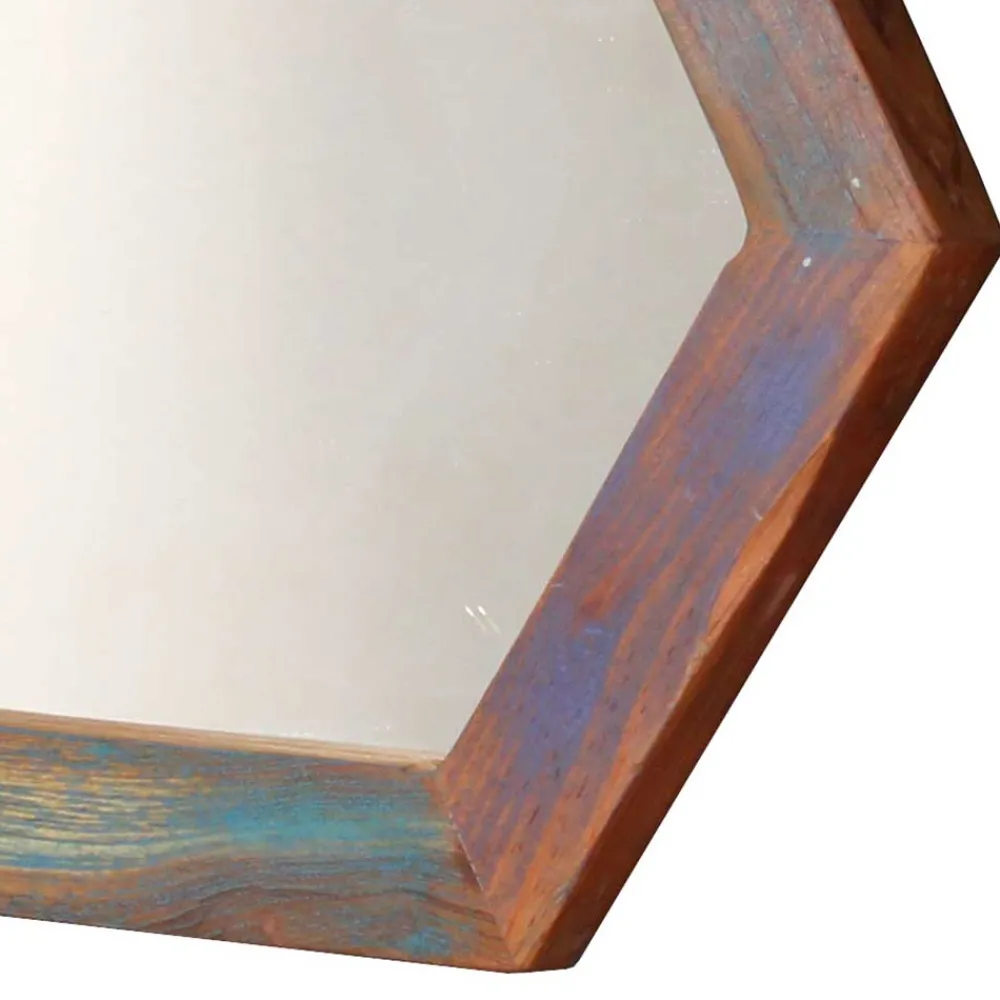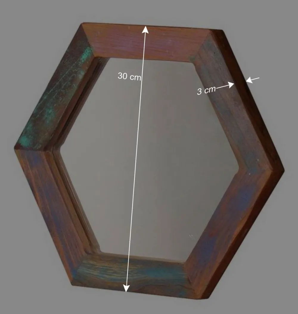 Der kantige Holzrahmen in sechseckiger Form verleiht dem Spiegel eine besondere Note und macht ihn zu einem modernen Designstück, das zugleich rustikal und zeitlos wirkt. Dank der Wandmontage lässt sich der Spiegel einfach anbringen und verleiht jeder Wand im Handumdrehen mehr Tiefe und Stil.