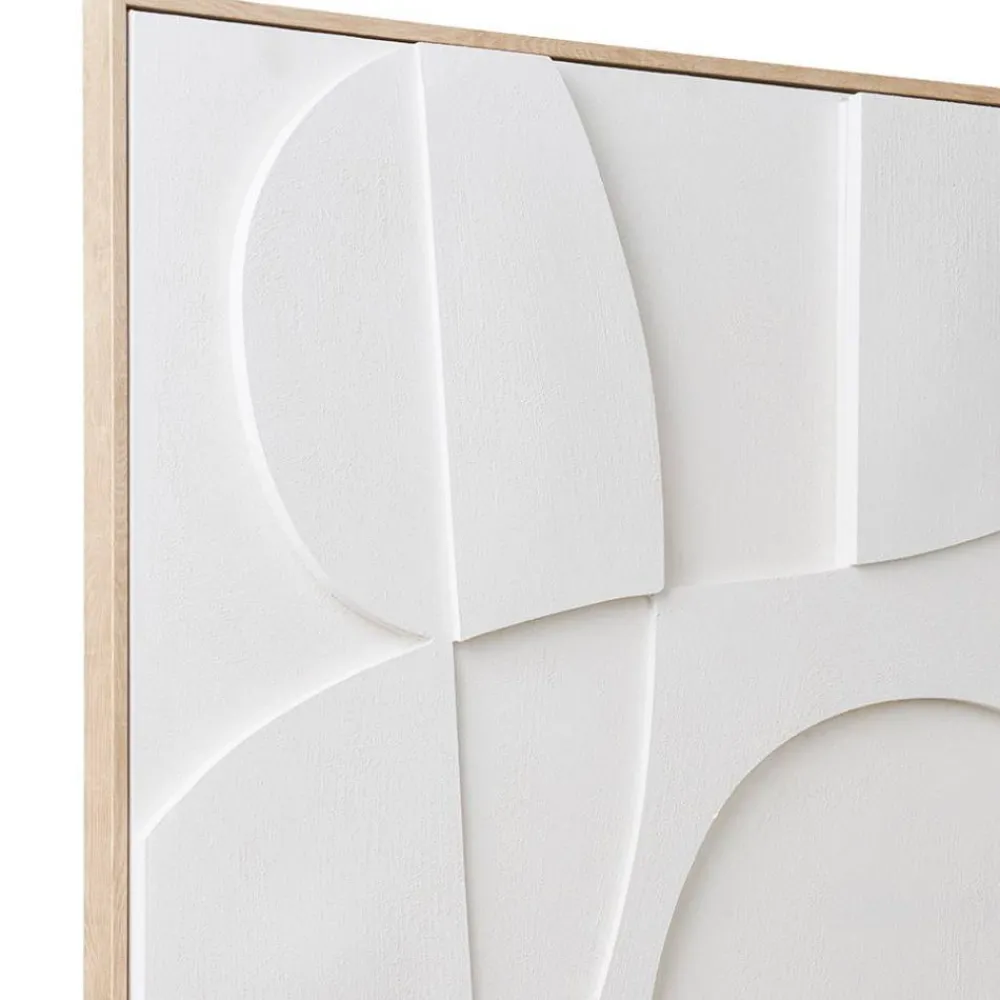 „Actino“ besteht aus einem hochwertigen Mix aus MDF, Polystyrene und Polyester. MDF – ein Holzwerkstoff mit homogener Dichte – bildet die stabile Basis. Das plastische Relief aus Polystyrene ist mit Polyester bezogen und weiß lackiert, wodurch die geometrischen Formen besonders präzise und klar zur Geltung kommen. Der Rahmen in Naturholzoptik rundet das Gesamtbild warm und stilvoll ab.