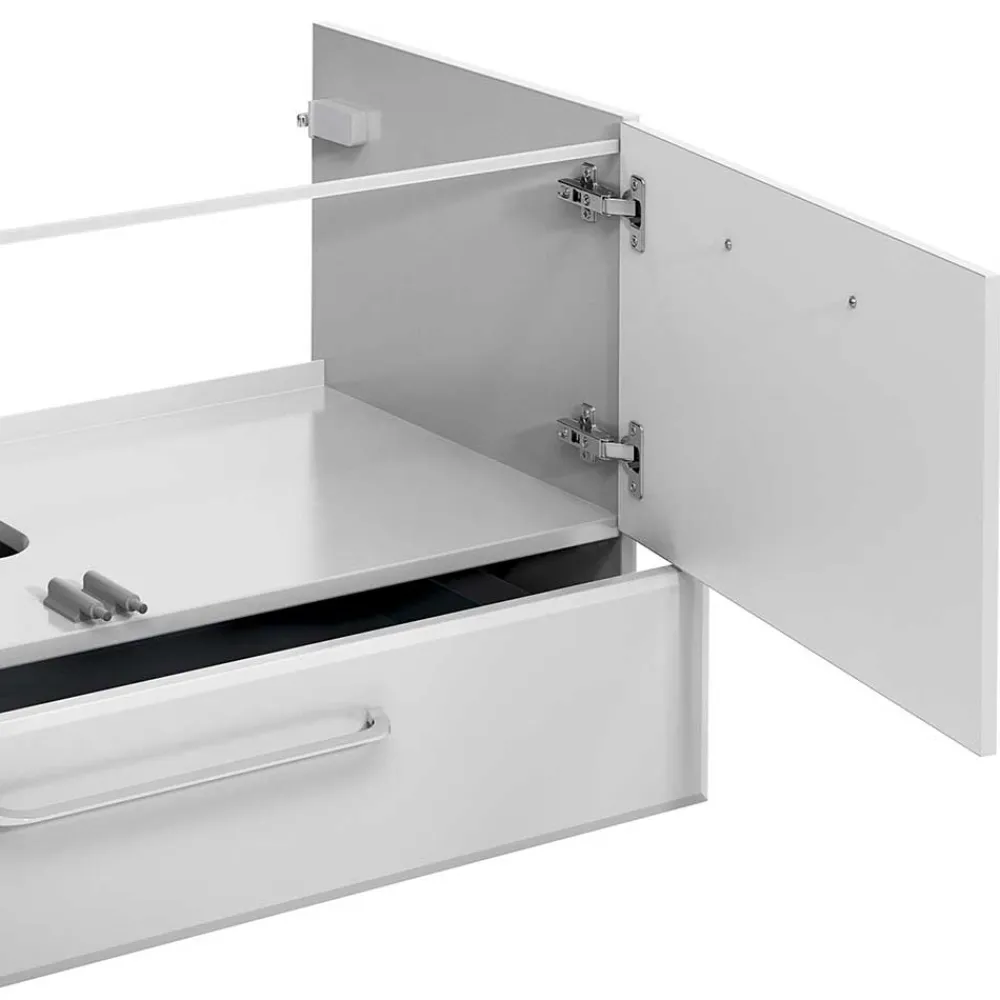 Für den Korpus der Waschtisch-Konsole „Estateas“ wurde robuster Holzwerkstoff (Spanplatte) verwendet. Die Materialstärke von 16 mm garantiert eine hohe Stabilität und Langlebigkeit. Eine weiße Melaminharz-Oberflächenbeschichtung schützt die Konsole und verleiht ihr pflegeleichte Eigenschaften: Die Oberfläche ist kratzfest und widerstandsfähig gegen Feuchtigkeit. Die hochglänzende Front wurde durch ein Tiefziehverfahren gefertigt und besticht durch eine attraktive Optik, während stoßfeste ABS-Kanten für zusätzlichen Schutz sorgen. Ein glänzender Bügelgriff aus Chrom setzt elegante Akzente und unterstreicht die moderne Linienführung.
