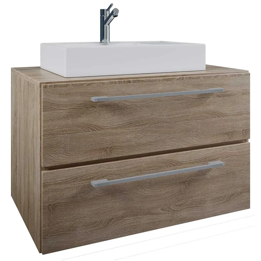 Mit einer Breite von 80 cm, einer Höhe von 52 cm und einer Tiefe von 46 cm bietet die „Caleena“ Waschtischkonsole ausreichend Platz für das stilvolle Aufsatzwaschbecken aus hochwertiger Keramik, das im Lieferumfang enthalten ist. Zwei großzügige Schubladen mit langlebigen Metallauszügen bieten viel Stauraum für Handtücher, Pflegeprodukte und Badutensilien – alles griffbereit und ordentlich verstaut. Die eleganten Bügelgriffe aus Metall in alufarbenem Finish setzen dabei einen dezenten Akzent und runden das moderne Erscheinungsbild perfekt ab.