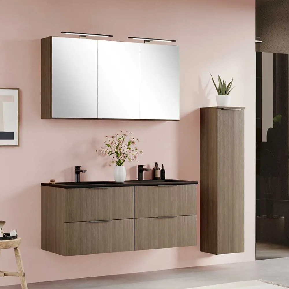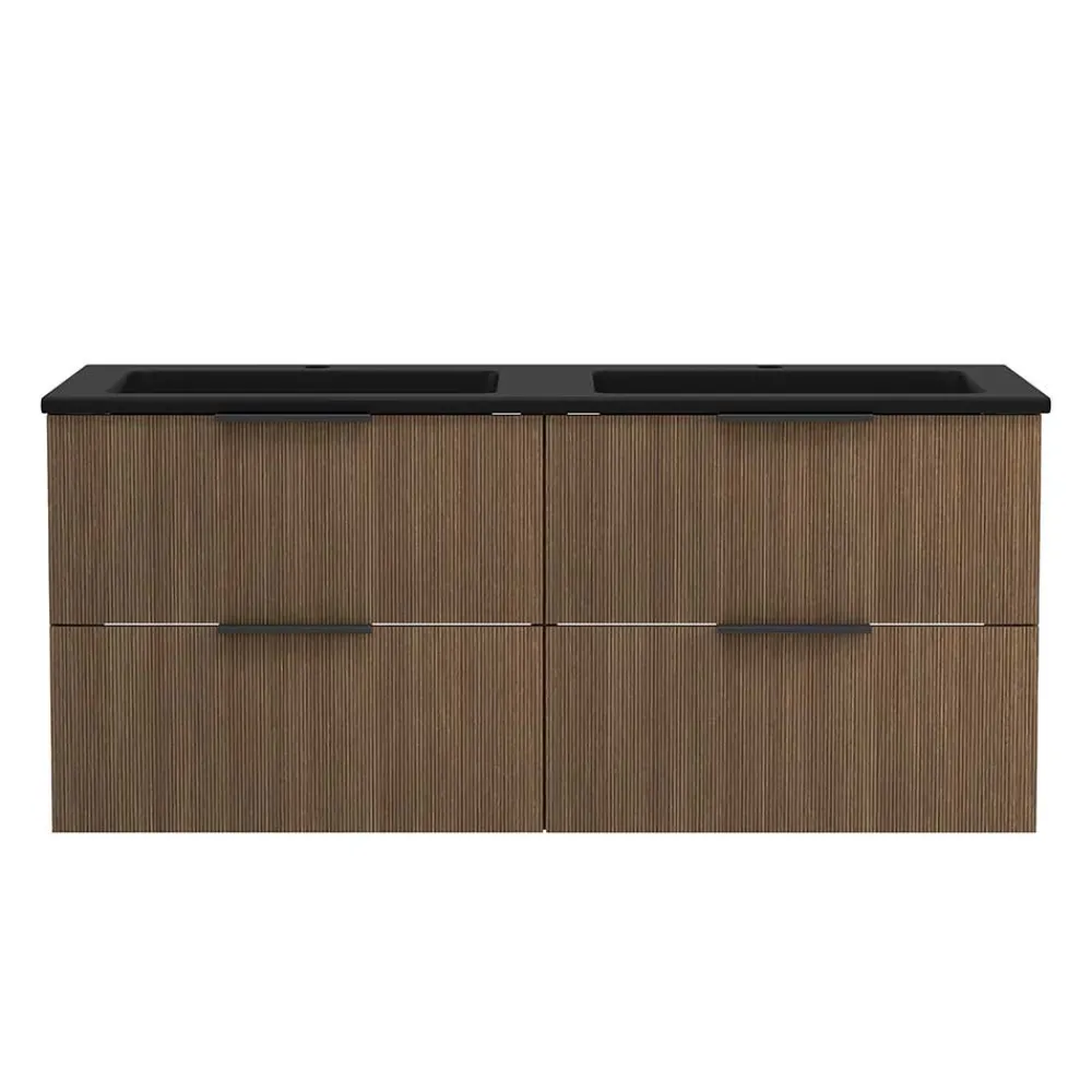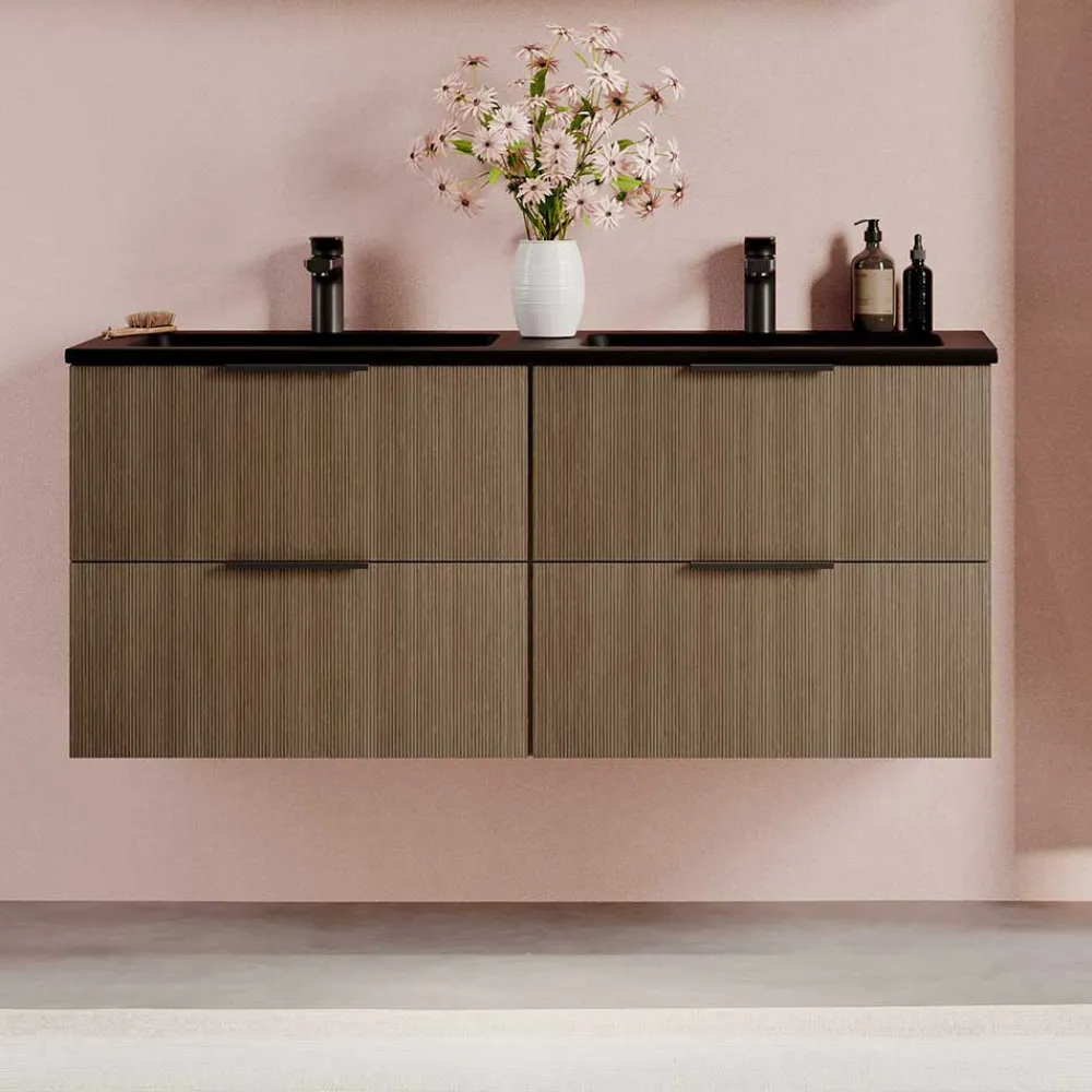 In einem Badezimmer, das Eleganz und Wohlfühlatmosphäre vereinen soll, darf ein Doppel-Waschtisch wie „Ucaida“ nicht fehlen. Das moderne Design beeindruckt mit klaren Linien und einem harmonischen Zusammenspiel aus dunkler Eiche und schwarzen Elementen. Während die rechteckige Form dem Möbelstück eine selbstbewusste Präsenz verleiht, bringen die sanft abgerundeten Kanten und die natürliche Holzoptik eine warme, einladende Stimmung in den Raum. Moderne Wohnästhetik bedeutet hier nicht Kälte, sondern die perfekte Balance aus zeitlosem Chic und gemütlicher Behaglichkeit.