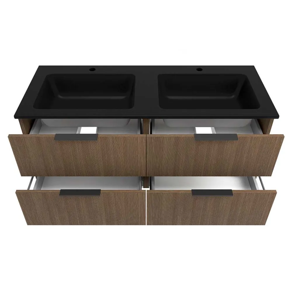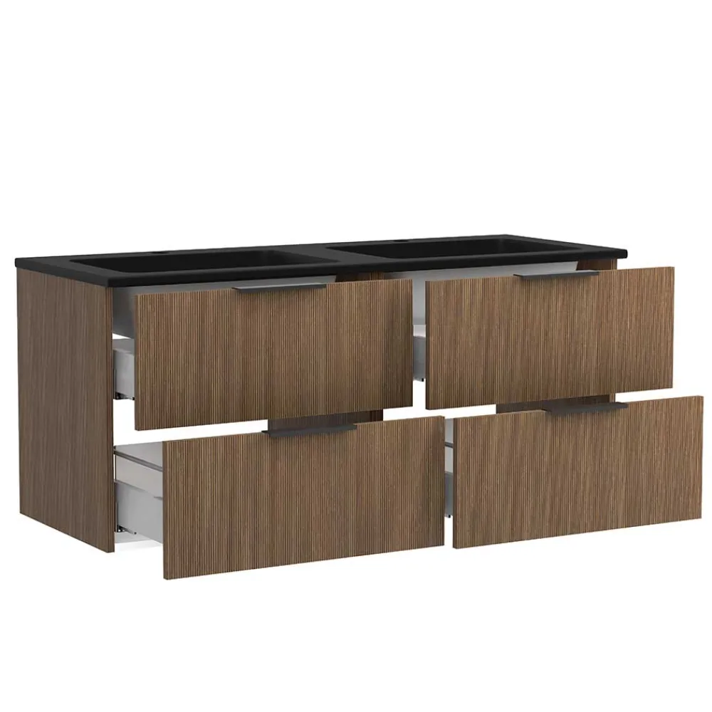 Mit einer Breite von 120 cm, einer Höhe von 54 cm und einer Tiefe von 47 cm ist „Ucaida“ kompakt genug, um in verschiedenste Bäder zu passen, und gleichzeitig groß genug, um Ordnung und Übersicht zu schaffen. Vier geräumige Schubladen bieten reichlich Platz für Handtücher, Pflegeprodukte und alles, was im Bad griffbereit sein soll. Dank robuster Metallauszüge gleiten die Schubladen sanft und leise, während die Soft-Close-Funktion dafür sorgt, dass sie sanft schließen – ganz ohne lästiges Zuschlagen. Die oberen Schubladen verfügen über praktische Siphonausschnitte, sodass der vorhandene Platz trotz Wasseranschlüssen optimal genutzt wird. Schwarze Kantengriffe aus Metall setzen einen modernen Akzent und liegen angenehm in der Hand, was das Öffnen der Schubladen zu einem kleinen Alltagsluxus macht.