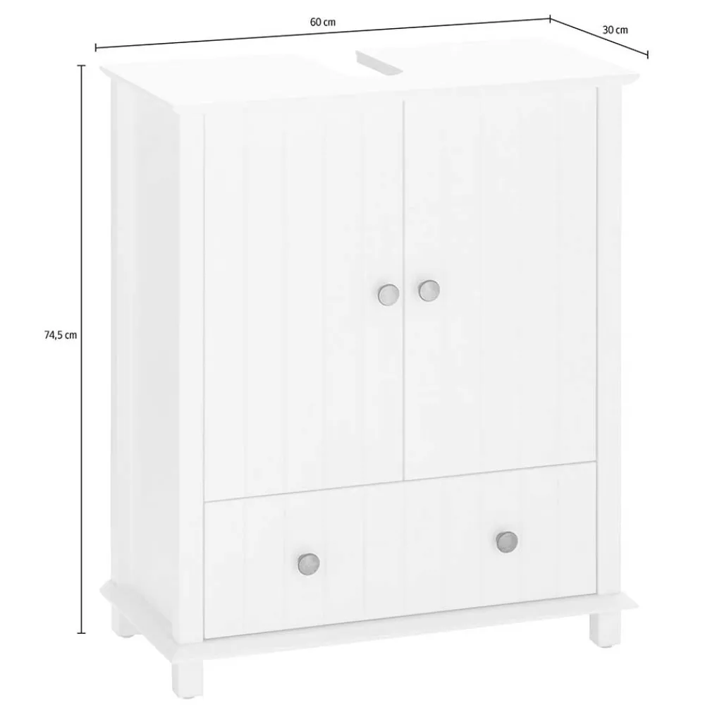 Abgerundet wird das stimmige Gesamtbild durch ein solides Vierfußgestell mit einer Höhe von etwa 5 cm. Bodenschoner schützen Ihre Fliesen zuverlässig und sorgen für eine sanfte Standfestigkeit. Die runden Metallknopfgriffe in antiker Optik setzen liebevolle Akzente und unterstreichen die nostalgische Anmutung des Designs. Mit kompakten Maßen von 60 cm Breite, 75 cm Höhe und 30 cm Tiefe fügt sich Akzinad perfekt auch in kleinere Badezimmer ein – ohne dabei auf Stauraum oder Stil zu verzichten.