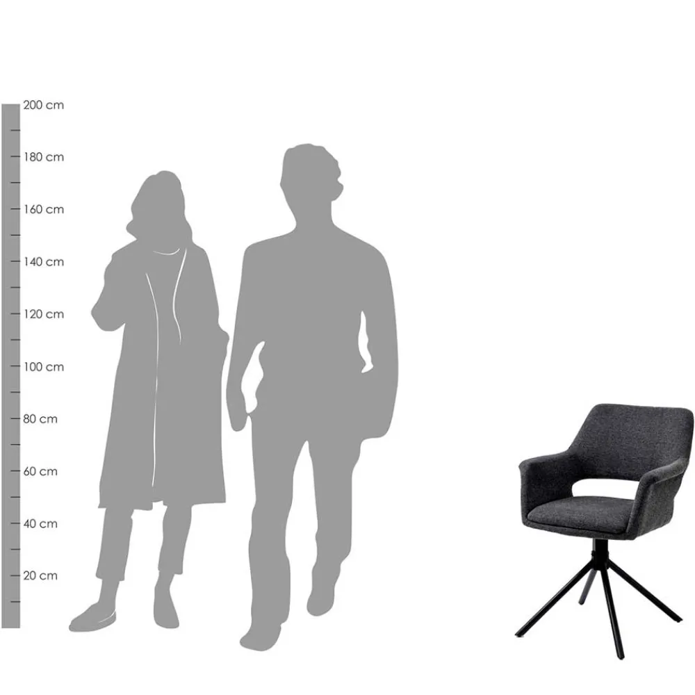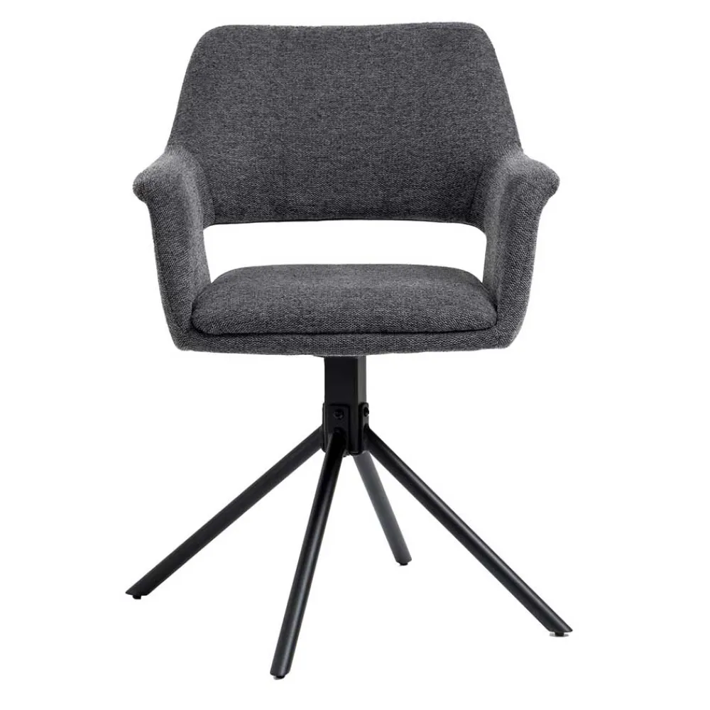 Für maximale Bewegungsfreiheit sorgt das schwarze, zierliche Stativgestell aus robustem Metall, das sich um 360° drehen lässt. So bleiben Sie flexibel am Tisch, ohne aufstehen zu müssen – perfekt für dynamische Gesprächsrunden oder lange Abende in geselliger Runde. Das filigrane Metallgestell unterstreicht dabei die moderne Linienführung des Sessels und sorgt gleichzeitig für Stabilität bis zu einer Belastung von 110 kg.