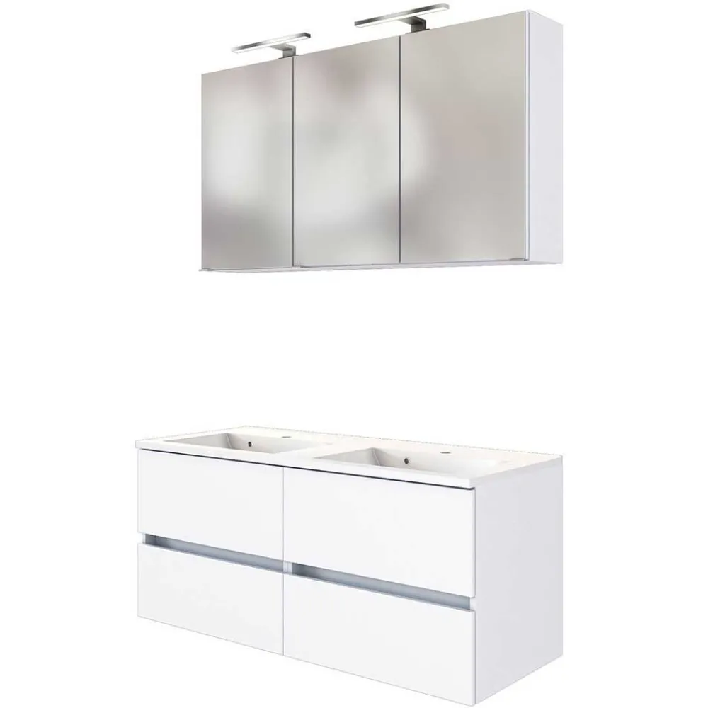 Diese hochwertige Kombination besteht aus einem großzügigen Spiegelschrank sowie einem formschönen Doppelwaschtisch. Beide Elemente sind zur Wandmontage vorgesehen, was nicht nur besonders platzsparend ist, sondern auch den modernen, schwebenden Look unterstreicht – ideal für kleinere Räume und designbewusste Bäder gleichermaßen. Das Möbelset wird zerlegt geliefert und lässt sich dank beiliegender Montageanleitung einfach selbst aufbauen.