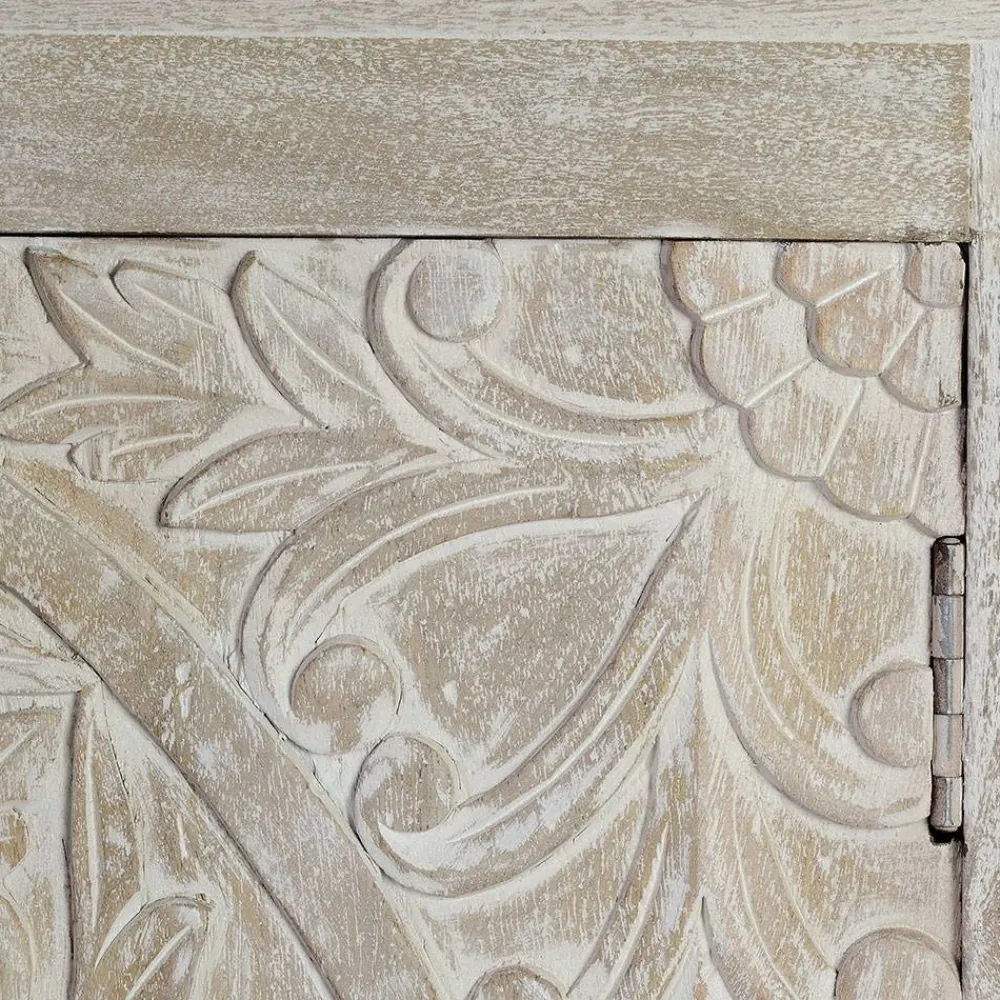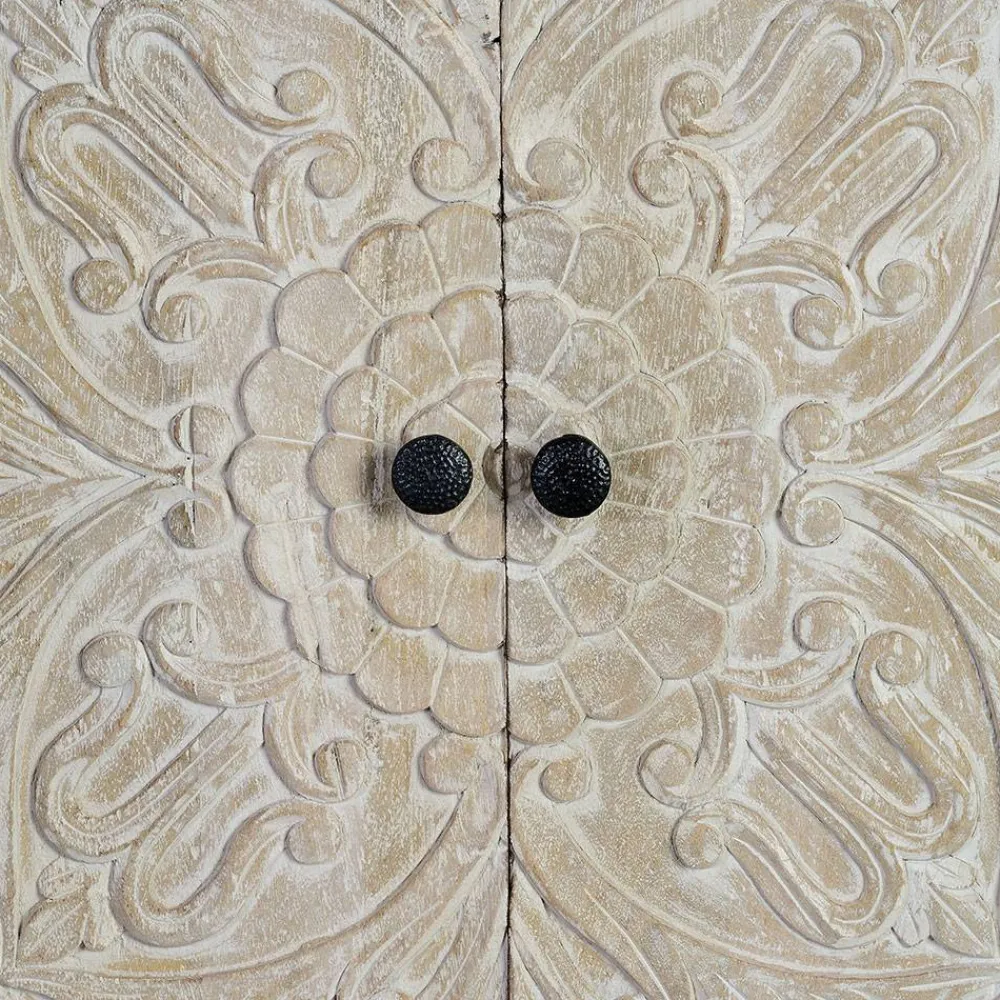 Das White Wash Sideboard „Bonany“ vereint rustikalen Charme mit kunstvoller Handwerkskunst und wird so zum absoluten Blickfang in jedem Wohnraum. Das antikweiße Finish verleiht dem Möbelstück eine nostalgische Note, während das schwarze Metallgestell einen stilvollen Kontrast setzt. Die kunstvoll geschnitzten Mandala-Motive auf den Fronten sorgen für eine unverwechselbare Optik und machen jedes Exemplar zu einem Unikat. Ob im Wohnzimmer, Essbereich oder Flur – dieses Sideboard verleiht Ihrem Zuhause eine besondere Atmosphäre.