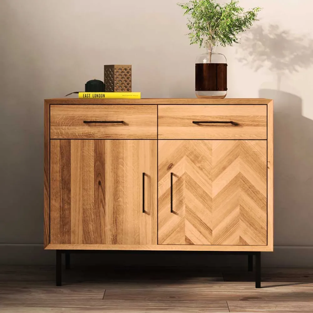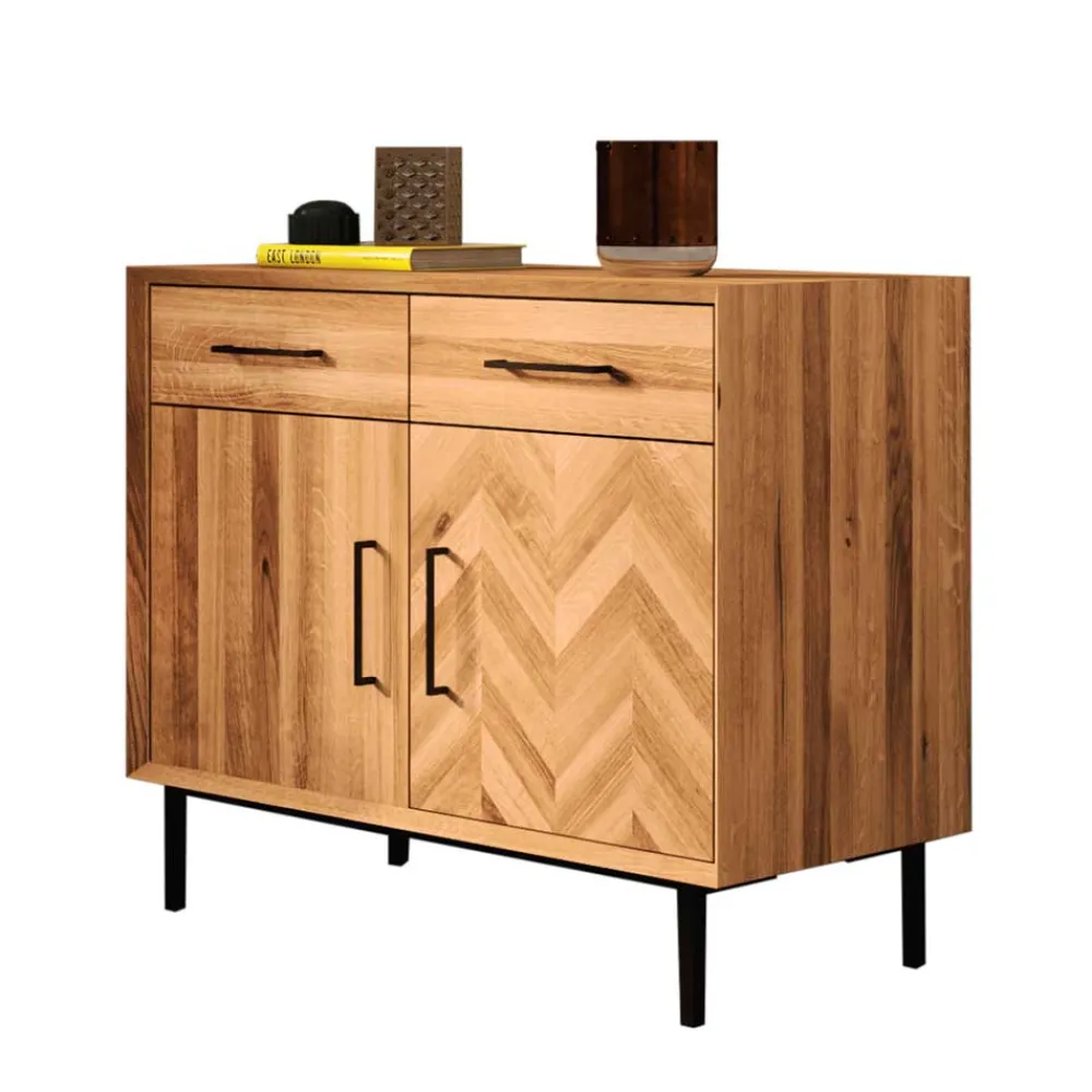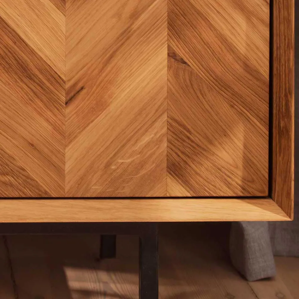 - Türen mit Finesse: Die gedämpften Metallbeschläge garantieren ein sanftes Schließen der Türen. Ein besonderes Highlight stellt die rechte Türfront dar, die mit einem Fischgrätmuster – ein klassisches und aufwändig gearbeitetes Muster – besticht.