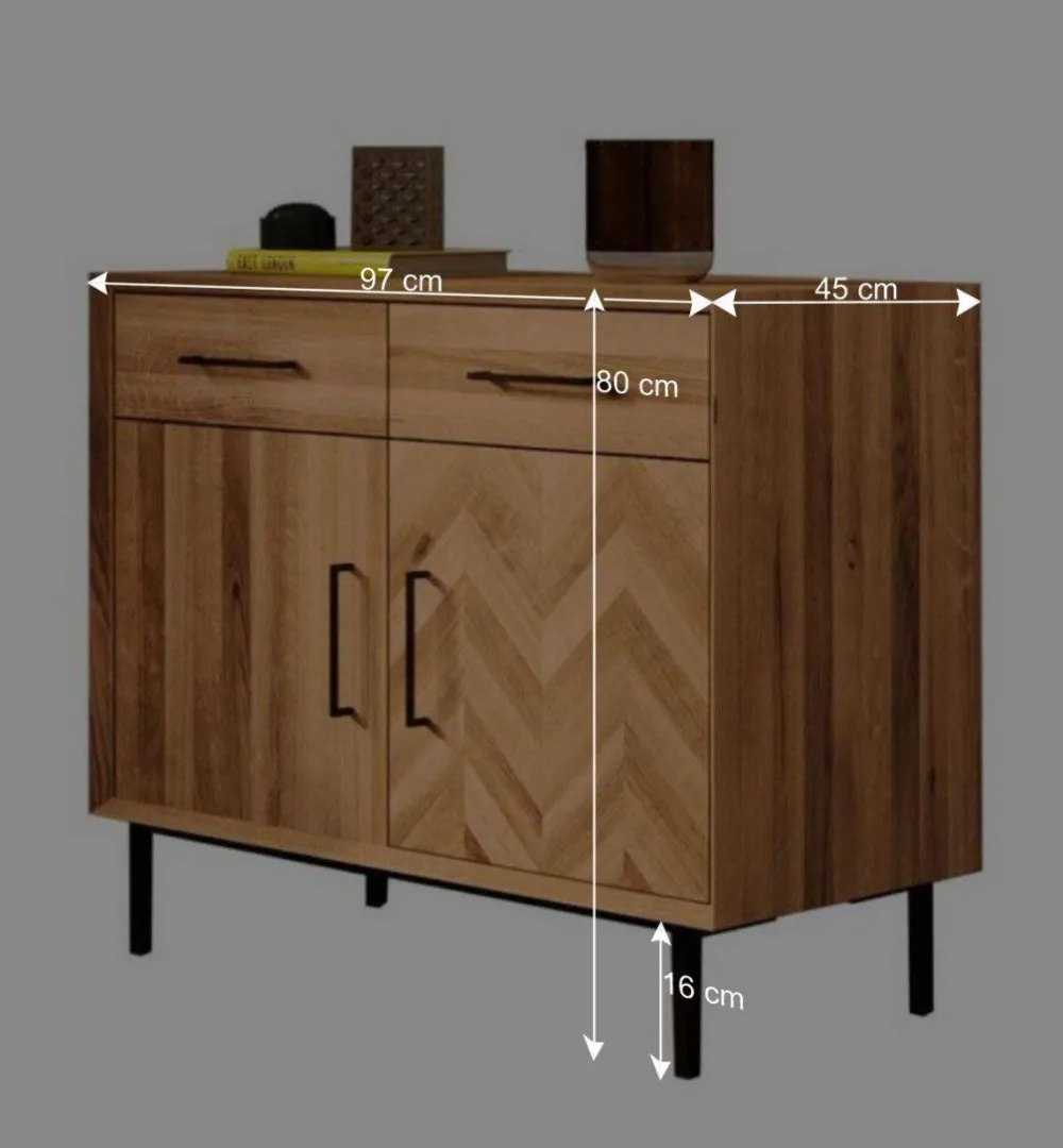 Mit Maßen von 97 cm Breite, 80 cm Höhe und 45 cm Tiefe bietet die Kommode „Kerfa I“ reichlich Stauraum. Sei es in den zwei Schubladen oder hinter den beiden Türen – hier findet alles seinen Platz. Das stabile Metallgestell sorgt mit einer Höhe von 16 cm nicht nur für einen schwebenden Look, sondern erleichtert auch das Reinigen darunter.