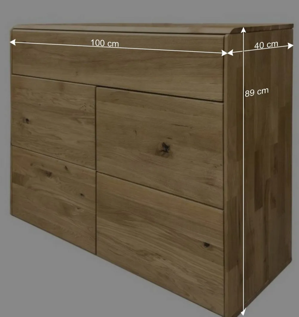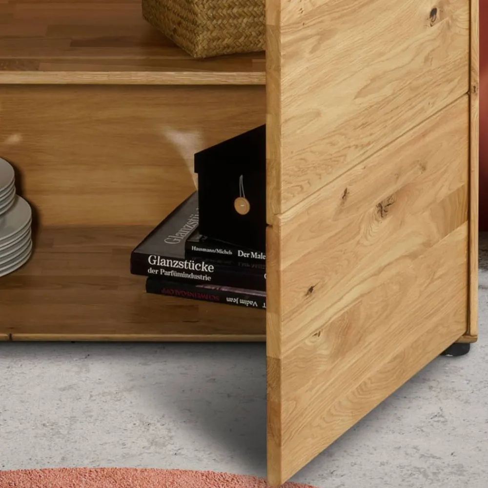 Gefertigt aus massiver Wildeiche, bietet die Kommode nicht nur eine besonders hohe Stabilität, sondern punktet auch durch die hervorragenden Eigenschaften des Holzes. Wildeiche ist robust, langlebig und trägt mit ihrem natürlichen Charme zu einer gemütlichen Wohlfühlatmosphäre bei. Die natürlich geölte Oberfläche betont die lebhafte Maserung, schützt das Holz und unterstützt ein gesundes Raumklima. Mit jedem Blick wird deutlich: Dieses Möbelstück ist ein echtes Unikat.