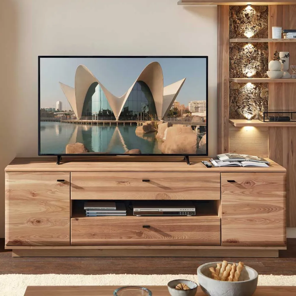 Die Fronten der Wohnwand „Cassna“ bestehen aus massivem Eschenholz, das für seine Widerstandsfähigkeit und seine edle Optik bekannt ist. Eschenholz bietet nicht nur eine langlebige und robuste Oberfläche, sondern auch eine natürliche Schönheit, die jedes Stück einzigartig macht. Der Korpus besteht aus MDF, das mit einer Folierung in Holzoptik Wildeiche veredelt wurde. Dieses Verfahren sorgt für eine realistische Holzstruktur und erhöht die Widerstandsfähigkeit des MDF gegenüber Feuchtigkeit und Kratzern. Die durchgehenden Lamellen der Fronten heben sich hervor und tragen zur optischen Harmonie bei, indem sie eine gleichmäßige und elegante Holzoberfläche bieten.