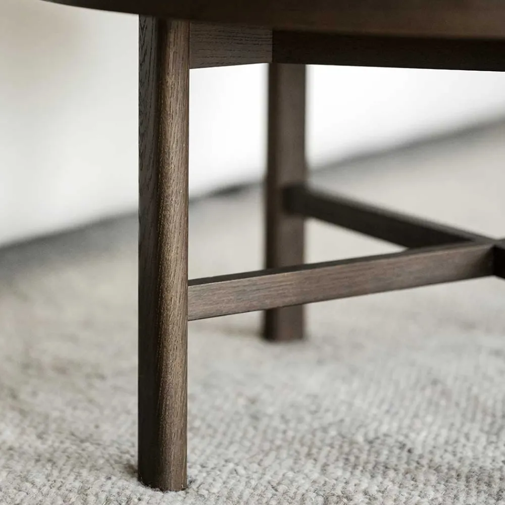 Das Gestell aus massivem Eichenholz sorgt nicht nur für die notwendige Standfestigkeit, sondern verleiht dem Tisch auch seinen charakteristischen Charme. Das dunkle Braun des lackierten Eichenholzes bildet einen schönen Kontrast zur hellen Keramikplatte. Die gekreuzten Streben bieten zusätzliche Stabilität und geben dem Tisch einen modernen, aber zeitlosen Look. Massivholz hat dabei viele Vorteile: Es ist langlebig, natürlich und strahlt Wärme aus, die Ihr Wohnzimmer sofort gemütlicher wirken lässt.