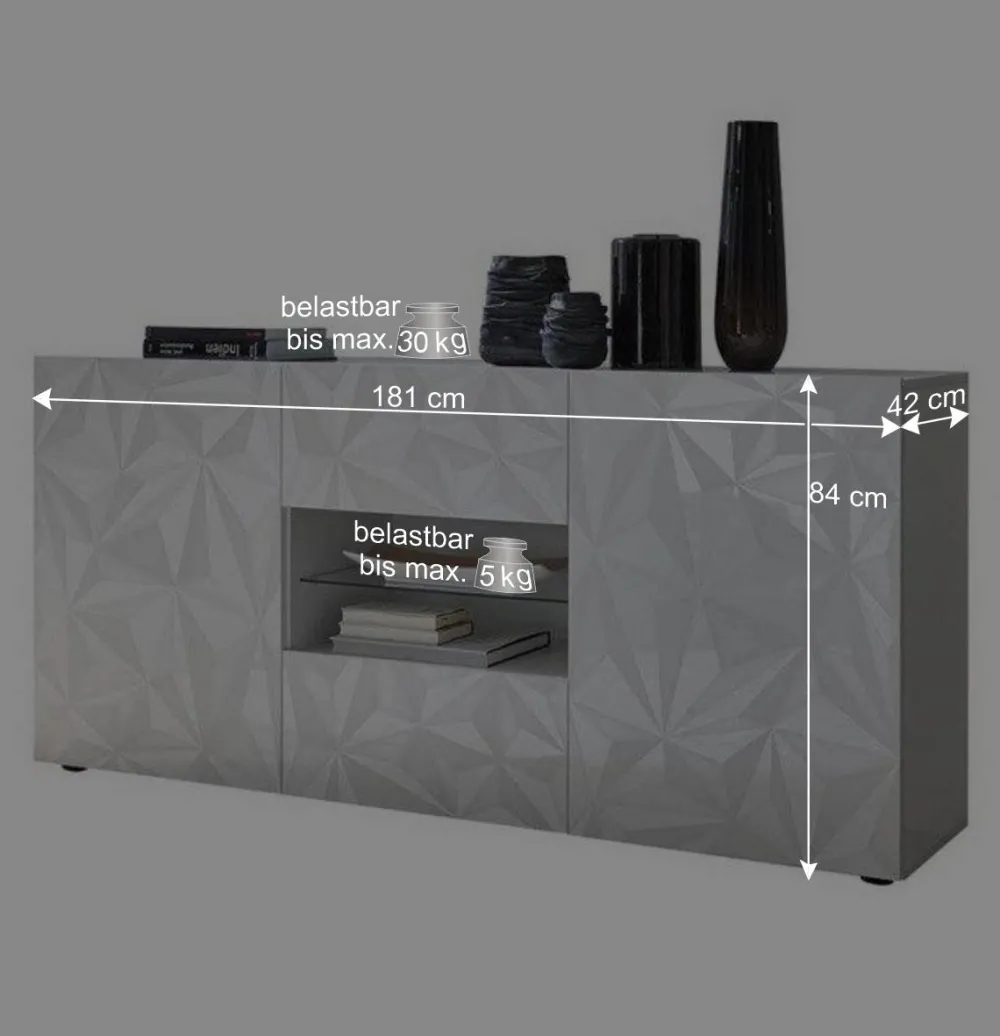 Die Oberflächen dieser Möbel sind in strahlendem Weiß Hochglanz lackiert. Diese Lackierung verleiht nicht nur einen luxuriösen Glanz, sondern schützt auch vor Kratzern und Abnutzung. Die Fronten sind mit aufwändigem Siebdruck dekorativer geometrischer Motive gestaltet, die einen Hauch von Kunst in Ihr Wohnzimmer bringen. Der Siebdruck sorgt für eine beeindruckende Detailtreue und erzeugt ein faszinierendes visuelles Erlebnis.