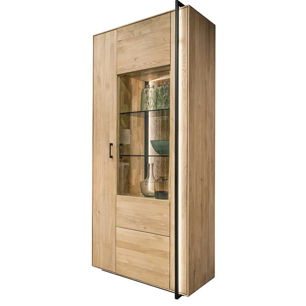 Als Kontrast zum warmen Eichenholz fügen die handlichen Metall-Bügelgriffe in Schwarz und die optional beleuchtbare, außen angebrachte Metallstange eine moderne Note hinzu. Diese Stange, bei Wunsch illuminiert, kreiert einen Lichteffekt, der den Schrank in einen Blickfang verwandelt.