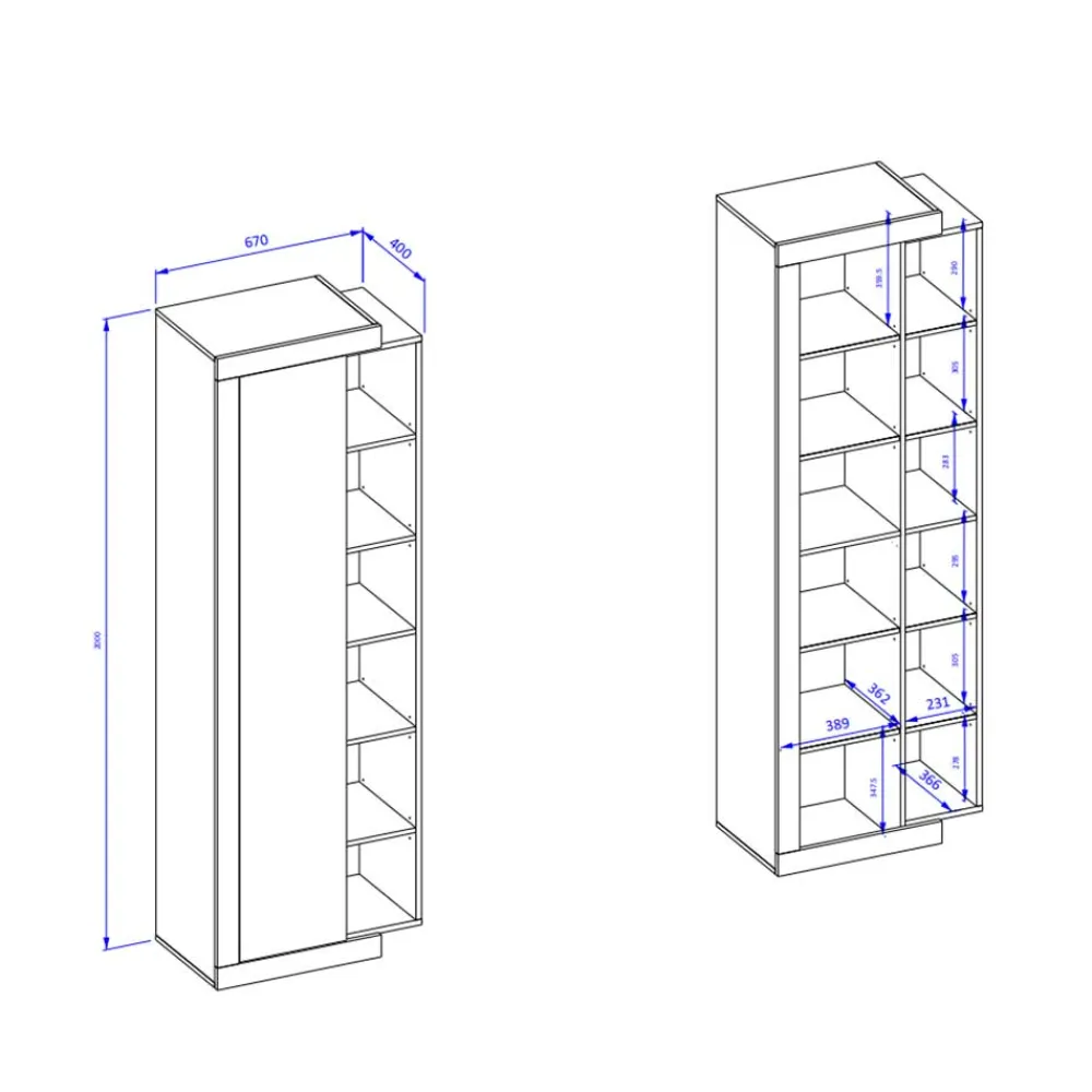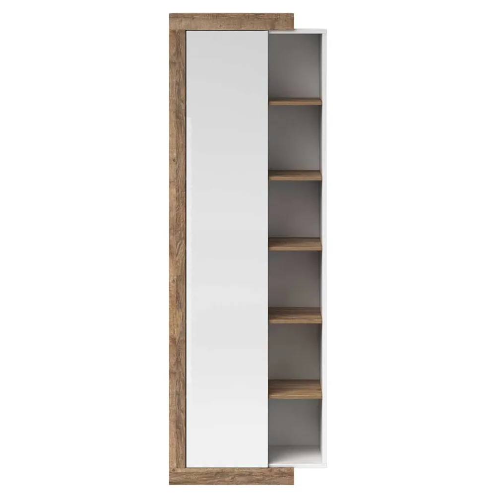 Hinter der dezenten, grifflosen Front mit innovativer Push-to-open-Funktion verbirgt sich großzügiger Stauraum – leichtes Antippen genügt, um die Tür sanft zu öffnen. Die fünf stabilen Einlegeböden im Inneren bieten viel Platz für Bücher, Geschirr oder Dekoartikel und überzeugen mit einer Tragkraft von jeweils bis zu 5 kg. Rechts ergänzen fünf offene Fächer in schwebender Optik das Gesamtbild – perfekt, um Ihre schönsten Lieblingsstücke eindrucksvoll zu präsentieren.