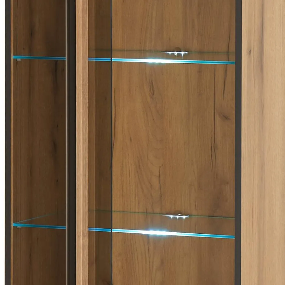 Wohnen gewinnt an Charakter, wenn ein Möbelstück nicht nur funktional, sondern auch ein Statement für Stil ist. Die Anbauwand Brocus verwandelt jedes Wohnzimmer in eine Oase der Ästhetik und des Komforts. Mit ihrem modernen Design und der harmonischen Kombination aus warmem Eiche-Dekor und eleganten schwarzen Griffleisten zieht sie alle Blicke auf sich. Das Set besteht aus einem großzügigen Vitrinen-Sideboard, einem formschönen Wandboard sowie zwei beeindruckenden Standvitrinen – perfekt aufeinander abgestimmt, um Ihrem Wohnraum Struktur und Eleganz zu verleihen.