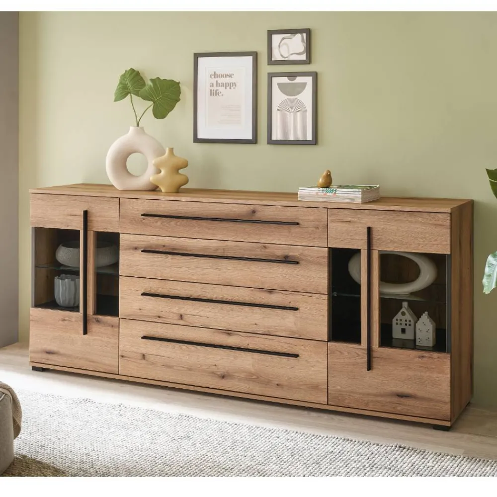 Jede Tür ist mit stabilen Metallbeschlägen ausgestattet, die eine langlebige Funktion garantieren. Dank beidseitig montierbarer Türanschläge können Sie die Aufstellung flexibel an Ihre Raumgegebenheiten anpassen. Die Schubladen gleiten sanft auf robusten Metallauszügen und lassen sich mühelos bedienen – ein spürbarer Komfort im Alltag. Die langen, schwarzen Kunststoff-Griffleisten setzen einen stilvollen Kontrast zur warmen Holzoptik und betonen das moderne Erscheinungsbild.