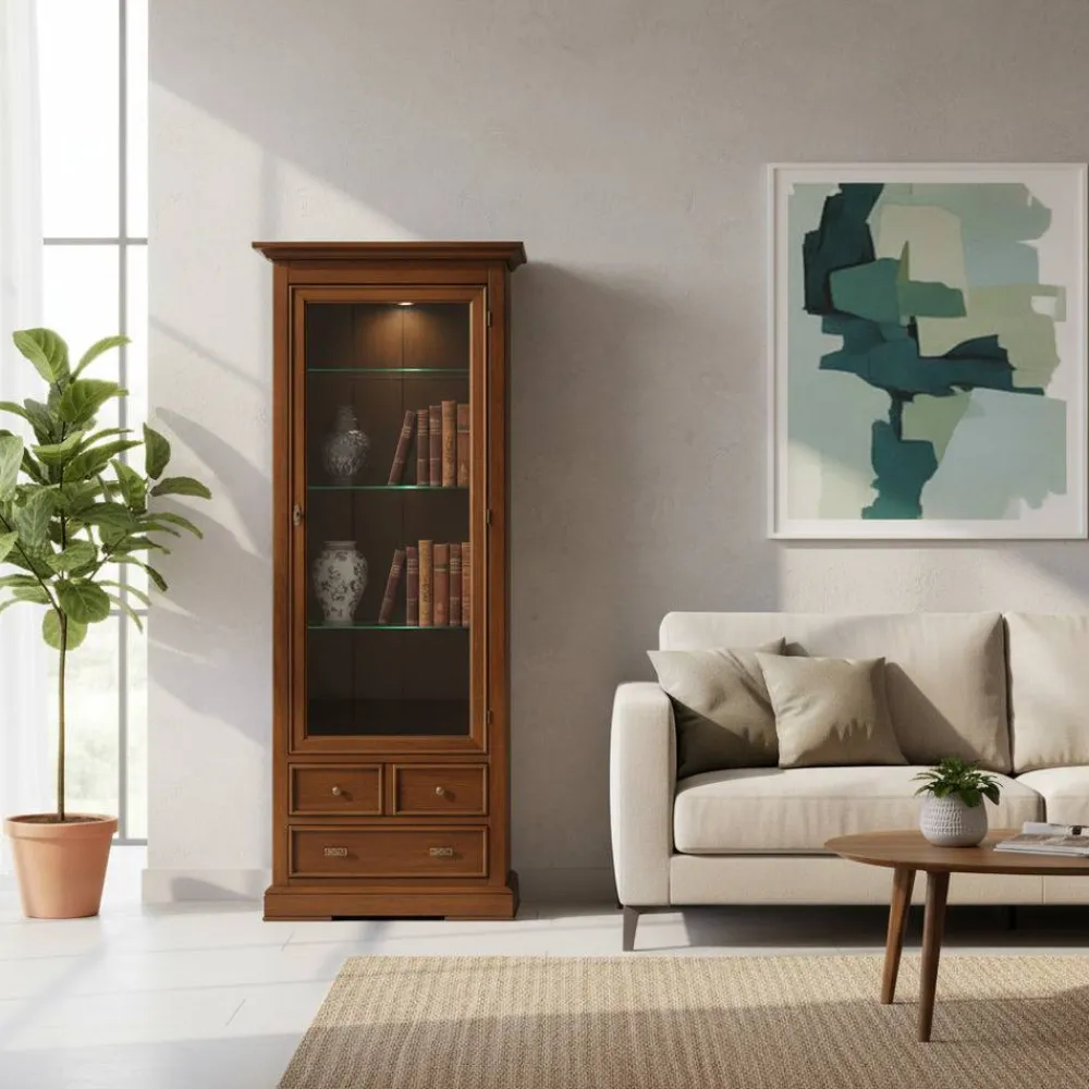 Mit dem Vitrinenschrank Istefanio bringen Sie einen Hauch von klassischem Stil und zeitloser Eleganz in Ihr Wohnzimmer. Klassischer Stil bedeutet hier mehr als nur schönes Design – es ist die Verbindung von Eleganz, Tradition und Wertigkeit. Der warme Walnussfarbton, der den gesamten Schrank durchzieht, schafft eine wohnliche Atmosphäre und verleiht Ihren Räumen eine unverwechselbare Note. Diese edle Optik passt zu jedem Einrichtungsstil und harmoniert besonders schön mit modernen sowie traditionellen Möbeln.