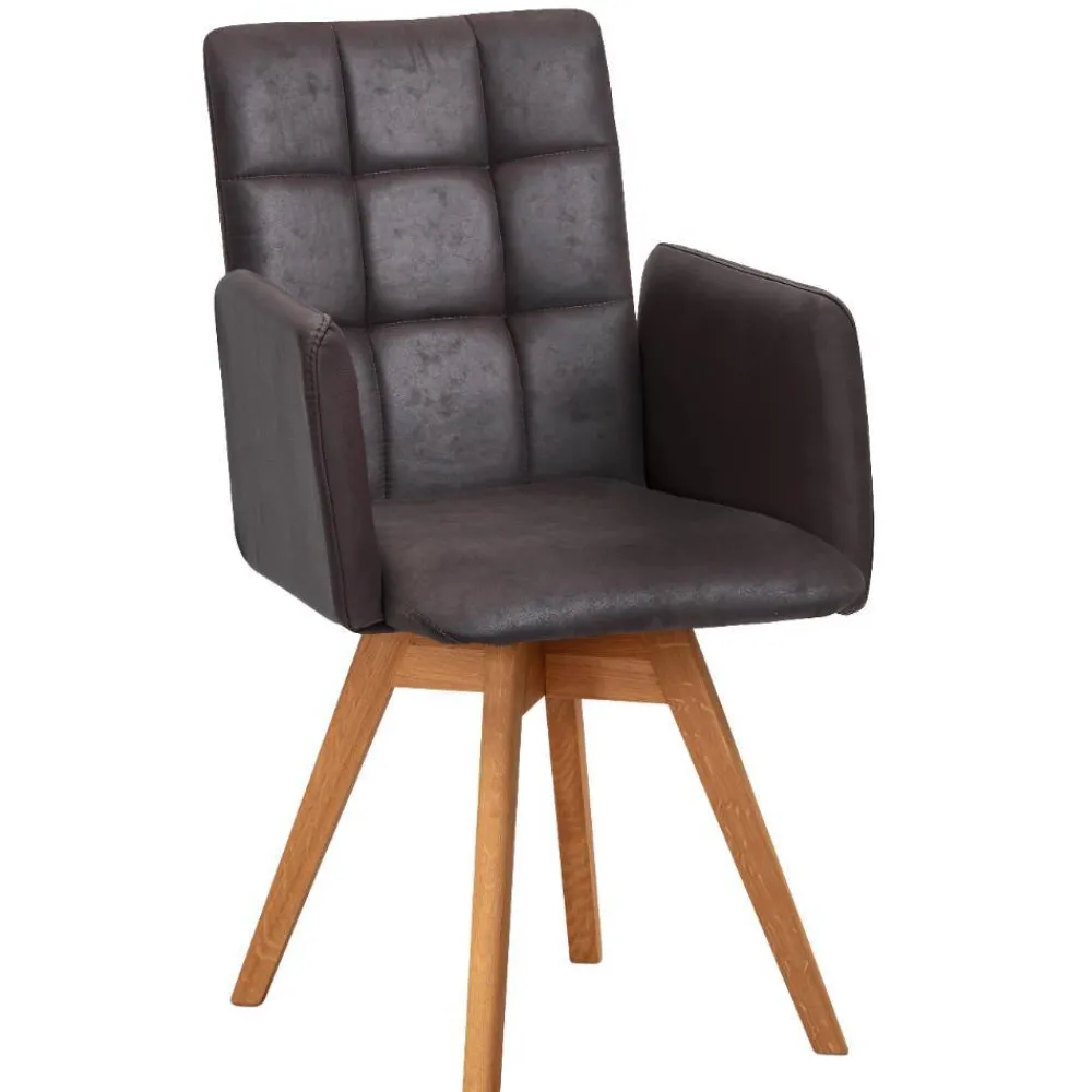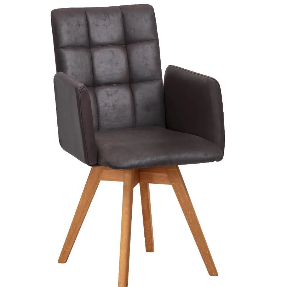 Der drehbare Esszimmerstuhl „Corabia“ überzeugt mit einem warmen Dunkelbraun in Kombination mit Wildeichefarben und bringt stilvolle Gemütlichkeit an Ihren Esstisch. Die leicht nach hinten geneigte Rückenlehne sorgt gemeinsam mit den bequemen Armlehnen für eine entspannte Sitzhaltung und lädt dazu ein, Mahlzeiten mit Familie oder Gästen in vollen Zügen zu genießen.