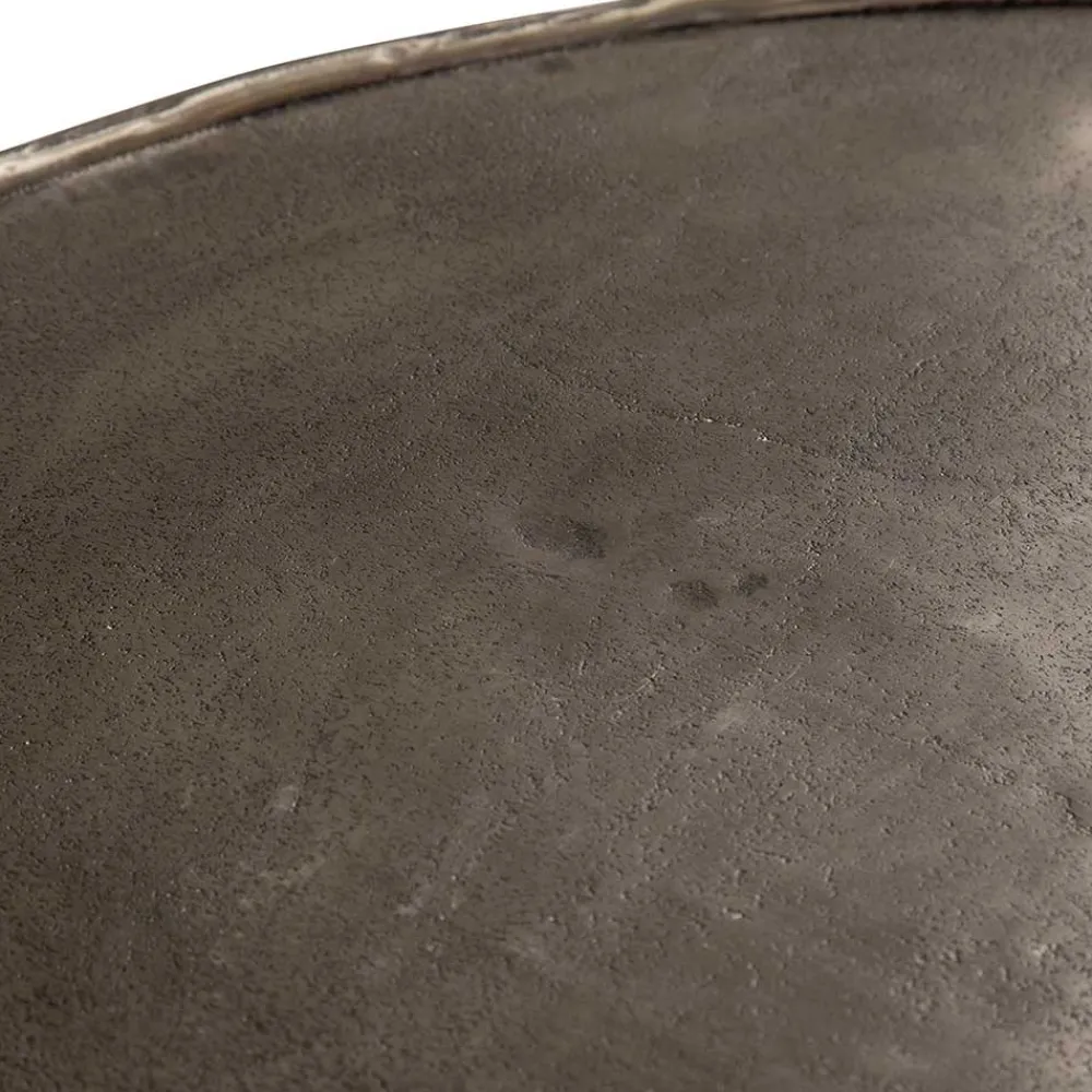 Jeder Tisch des Duos „Grodasso“ zeichnet sich durch seine runde Form und die exklusive Verwendung von hochwertigem Aluminium aus. Die Tischplatten sind in einem ansprechenden Schwarznickel-Finish gehalten, das mit einer unregelmäßigen Struktur für eine authentische Optik sorgt. Umlaufende Ränder bieten nicht nur einen visuellen Abschluss, sondern erhöhen auch die Funktionalität, indem sie das Herunterfallen von Gegenständen verhindern.