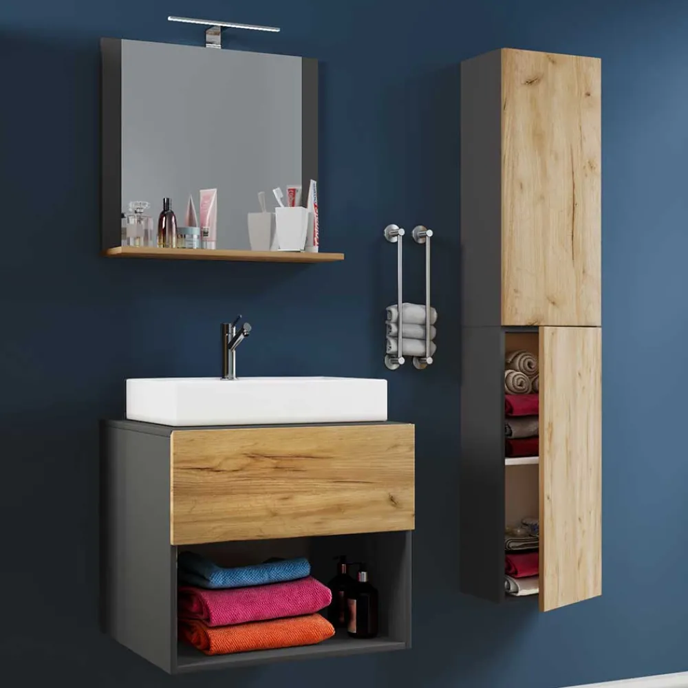 Gefertigt aus robustem Holzwerkstoff und Sicherheits-Spiegelglas bietet das Set eine solide, alltagstaugliche Basis für den täglichen Einsatz. Die melaminbeschichteten Oberflächen in Anthrazit und Wildeiche Honigfarben sind nicht nur optisch ein Highlight, sondern auch besonders pflegeleicht und widerstandsfähig gegen Feuchtigkeit, Kratzer und Verschmutzungen – ideal für das anspruchsvolle Badezimmerumfeld. Einfach abwischen, sauber, fertig.