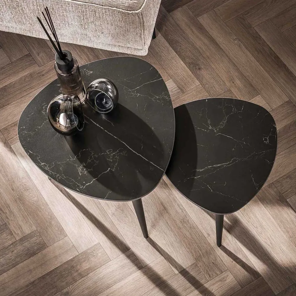 Die Tischplatten sind mit einer edlen Keramikauflage in Schwarz-Schwarzgrau-Maserung versehen. Keramik ist extrem robust und widerstandsfähig gegenüber Kratzern, Hitze und Flecken – ideal für ein Möbelstück, das sowohl optisch als auch praktisch hohen Ansprüchen gerecht werden soll. Die Keramikoberfläche ist pflegeleicht und behält ihren schönen Look auch nach Jahren.