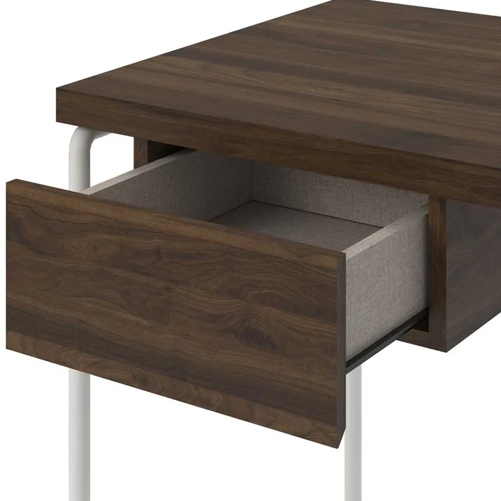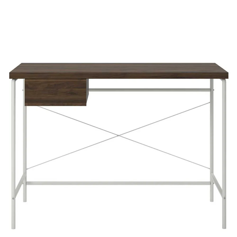 Der „Meskus“ Schreibtisch überzeugt nicht nur durch sein ästhetisches Design, sondern auch durch hochwertige Materialien. Hergestellt aus Holzwerkstoff und Metall, garantiert er Stabilität und Langlebigkeit. Die Tischplatte aus MDF ist in edler Walnuss Holzoptik foliert und trägt problemlos bis zu 36 kg. Das filigran verstrebte Vierfußgestell aus weiß pulverbeschichtetem Metall sorgt nicht nur für Stabilität, sondern setzt auch einen modernen Akzent.