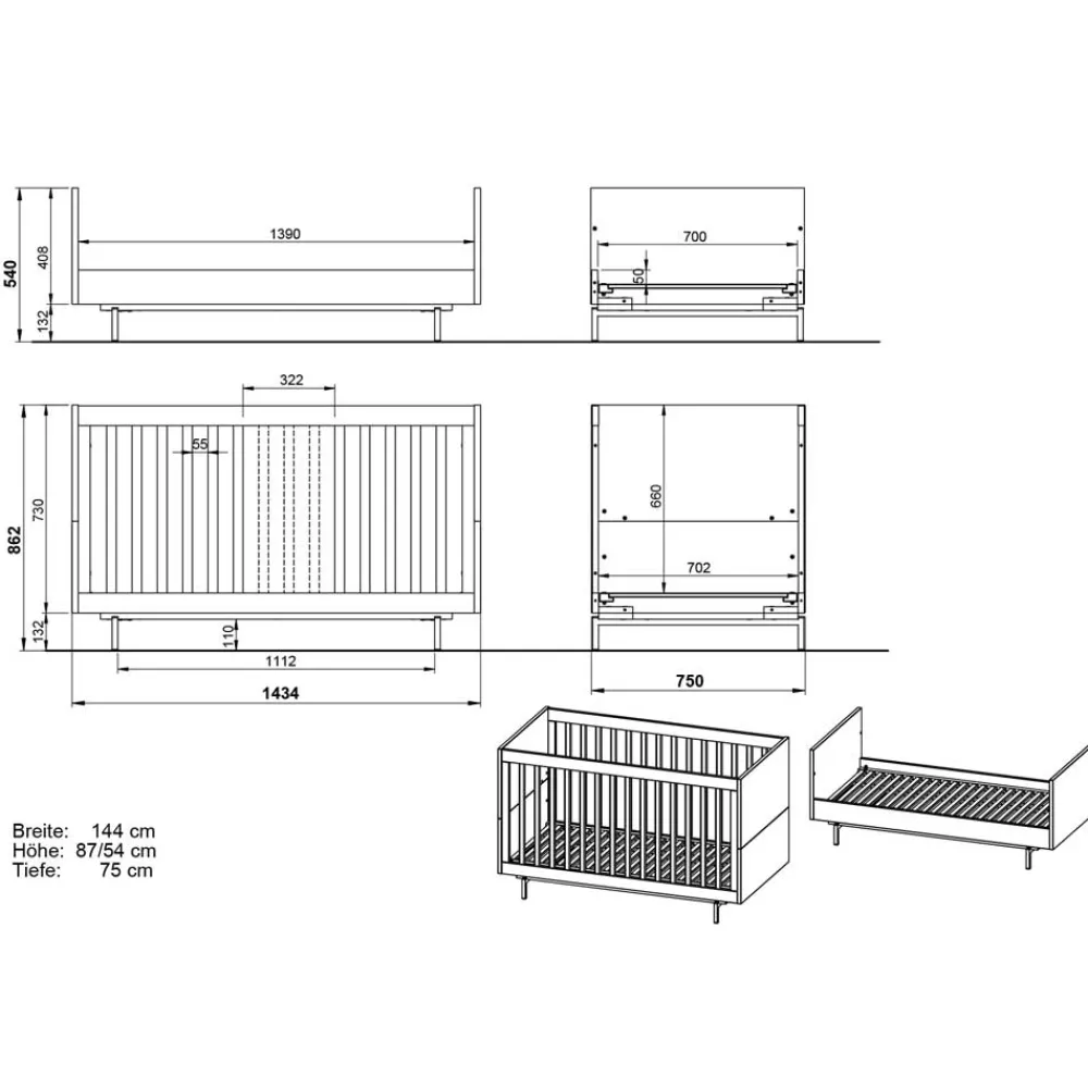 Ein besonderes Highlight sind die mitgelieferten Umbauseiten: Damit verwandelt sich das Kinderbett im Handumdrehen in ein Juniorbett, das bis ins Grundschulalter genutzt werden kann. Das spart nicht nur Geld, sondern auch Nerven – denn Ihr Kind kann sich weiterhin auf seinen vertrauten Schlafplatz verlassen. Die empfohlene Matratzenhöhe liegt bei 13 cm (nicht im Lieferumfang enthalten). Das Bett ist bis zu 100 kg belastbar.