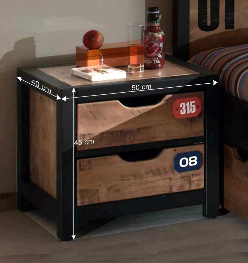 Der Nachttisch Krefos – Ihr funktioneller Begleiter zum Bett, der Stil und Praktikabilität miteinander vereint. Mit seinem modernen Design, das eine geradlinige Formgebung mit einem Hauch von Industrial Chic und natürlicher Eleganz verbindet, wird dieser Nachttisch zum Blickfang im Jugendzimmer. Die aufgebrachten Zahlen und Applikationen verleihen ihm einen extravaganten Look. Hergestellt aus teilmassivem Kiefernholz, bietet dieser Nachttisch nicht nur eine ansprechende Optik, sondern auch pflegeleichte, strapazierfähige Oberflächen und erstklassige Qualität für eine lange Lebensdauer.